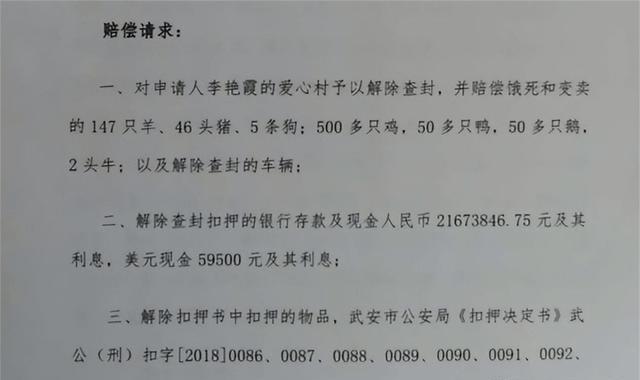 但最让人惊奇的是,在李利娟被抓进去后,她的家人竟向法院申请了赔偿,包括李利娟“爱心村”的资产,以及车辆,甚至还有家禽。