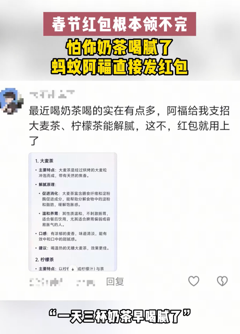 不仅如此,两个AI分工合理,一个管快乐,一个管健康,蚂蚁阿福还「售后到位」,要发16.8元的红包让大家去买酸奶解腻!