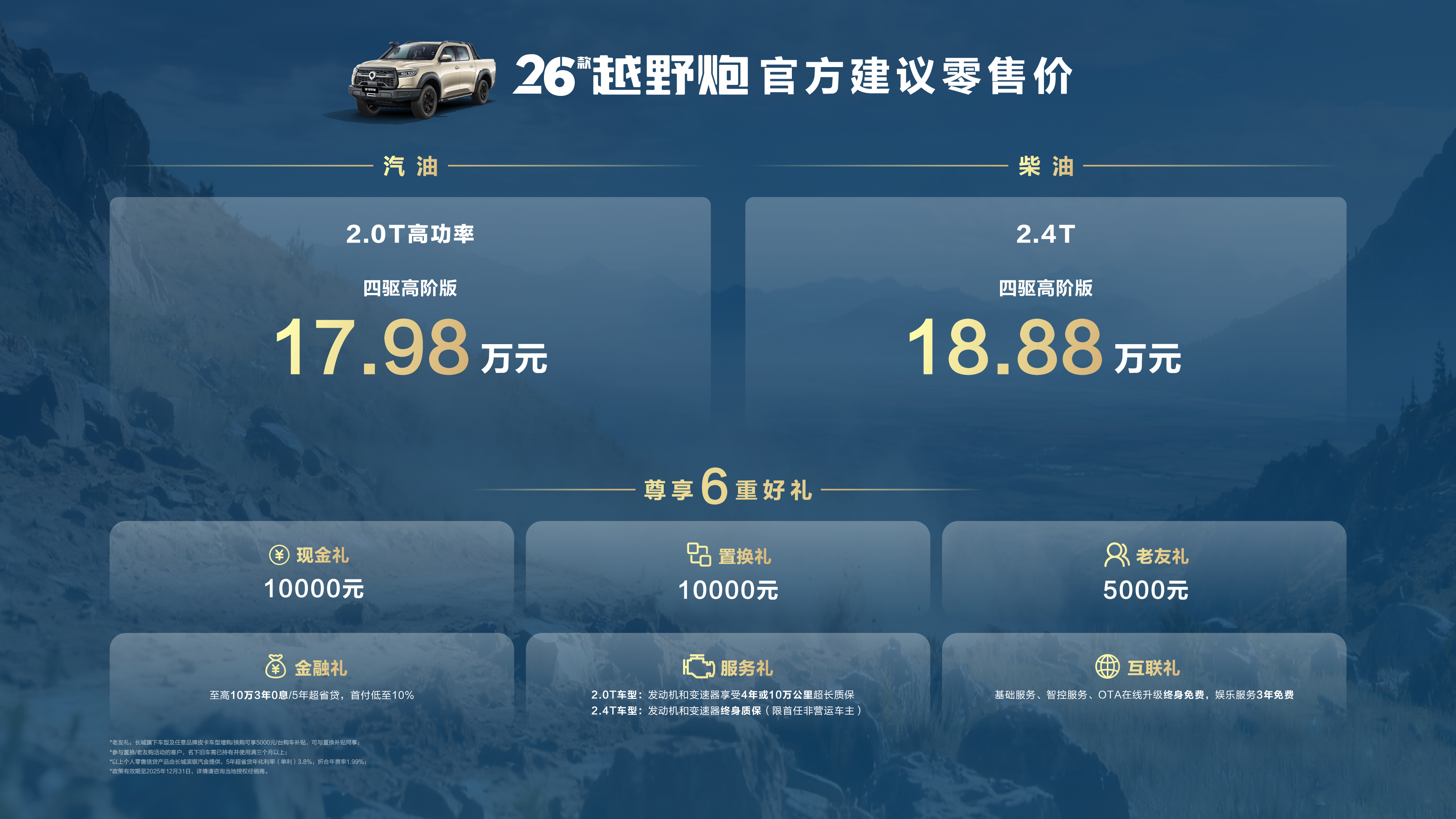 购车用户还可享多重上市礼遇,诚意满满。2026款商用炮用户可享6000元现金礼、5000元置换礼、3000元老友礼以及金融礼、服务礼五重大礼;2026款乘用炮可享受6000元现金礼、5000元置换礼、3000元老友礼以及金融礼、服务礼、互联礼六重大礼;2026款越野炮用户则可享10000元现金礼、10000元置换礼、5000元老友礼以及金融礼、服务礼、互联礼六重大礼。