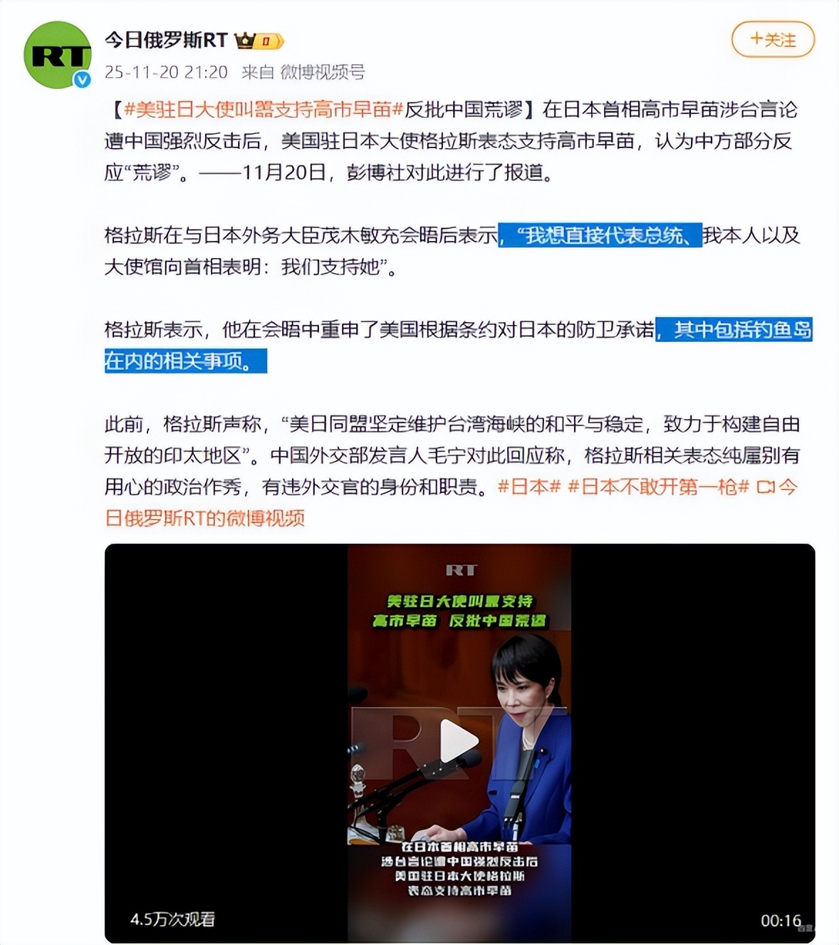 高市早苗在日本国内闹得沸沸扬扬,美国驻日大使格拉斯之前又是表态支持又是把钓鱼岛扯进来,搞得好像美国会全力撑腰似的。