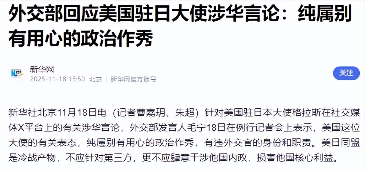 当下中日关系因高市早苗谈论台湾问题一直很紧张,就在中国的反击举措渐渐加强的时候,美国驻日本大使格拉斯却忽然大张旗鼓地掺和进来。
