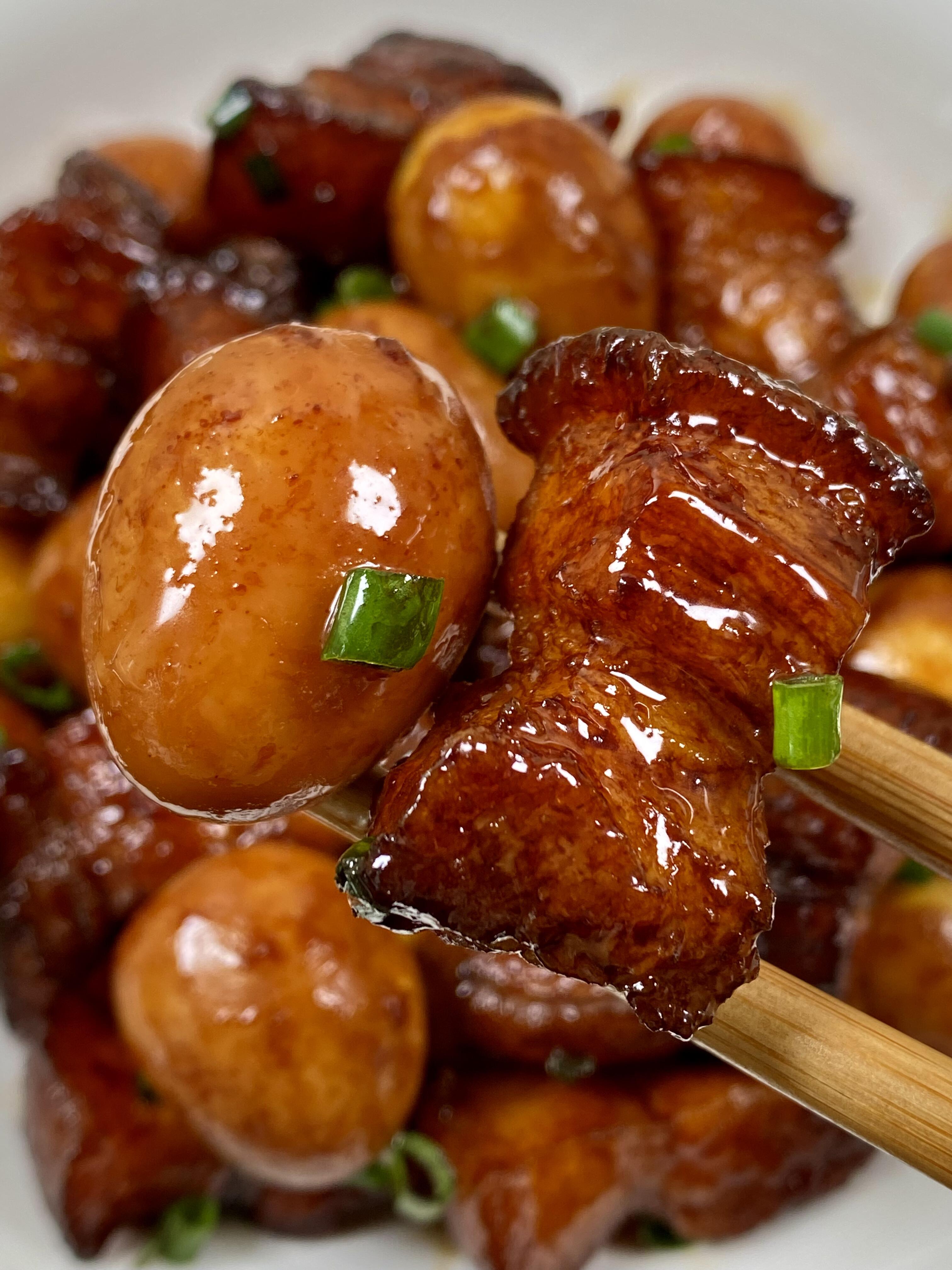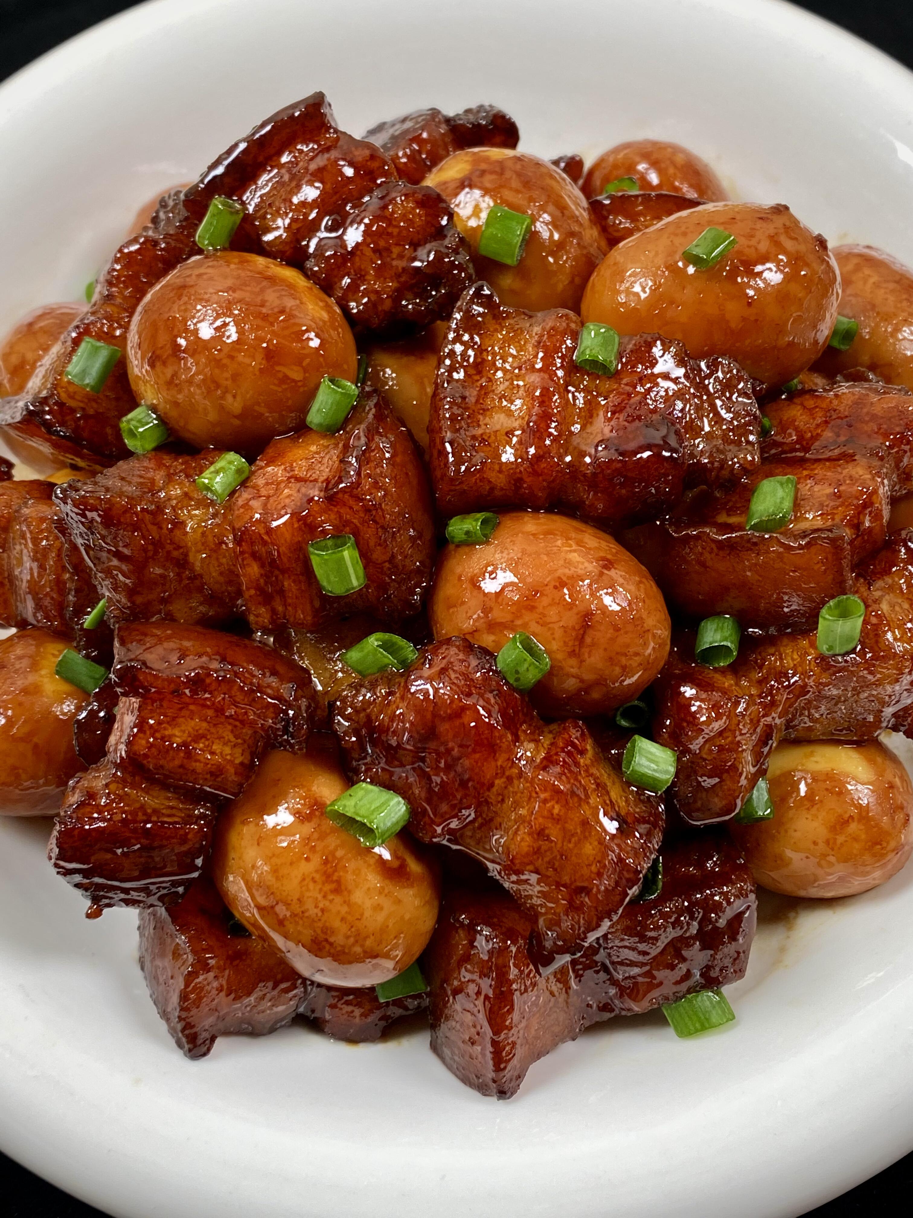 把红烧肉和鹌鹑蛋盛出来,撒上一点葱花点缀,一道色香味俱全的红烧肉鹌鹑蛋就大功告成啦!夹一块红烧肉,肥而不腻、瘦而不柴,入口即化;再来一颗鹌鹑蛋,蛋白Q弹、蛋黄绵密,满满的肉汁在嘴里爆开,简直是人间美味!