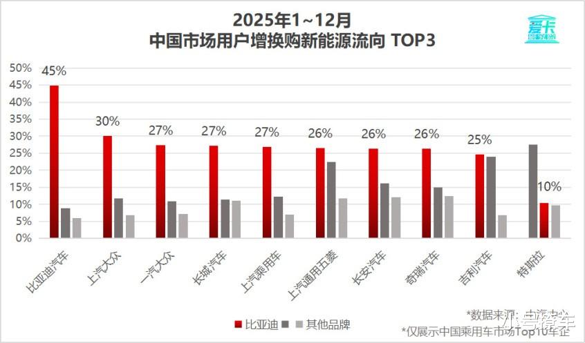 更关键的是,比亚迪在新能源增换购市场形成强大“虹吸效应”,无论是比亚迪自身老车主,还是主流合资、自主品牌车企用户,在置换新能源车型时,均将比亚迪列为首选品牌。在国内乘用车市场TOP 10车企用户中,平均每4个增换购新能源的用户里,就有1个投向了比亚迪,这一数据不仅佐证了比亚迪在新能源增换购市场的统治力,更印证其已成为全行业用户置换新能源的核心流向品牌。