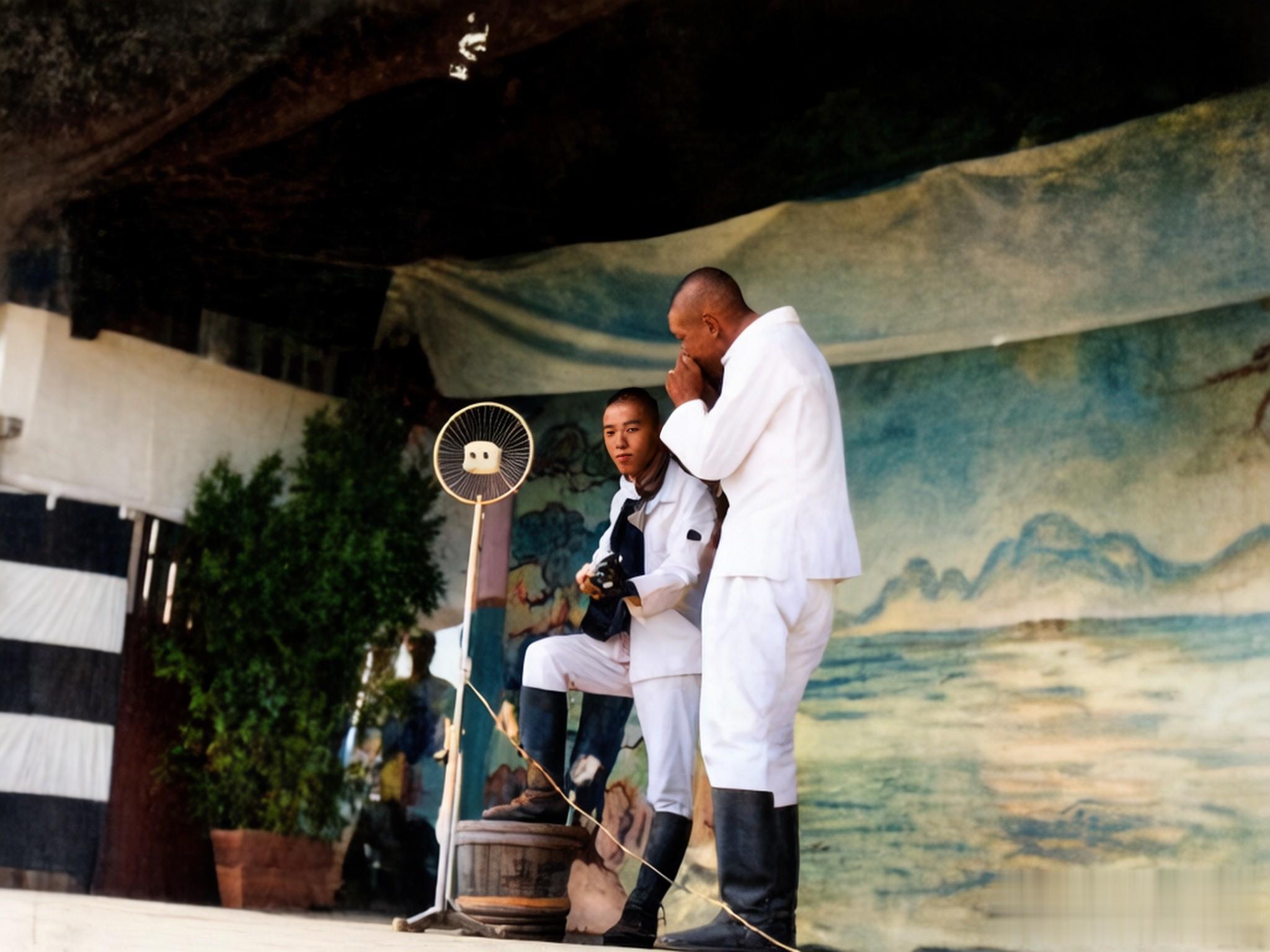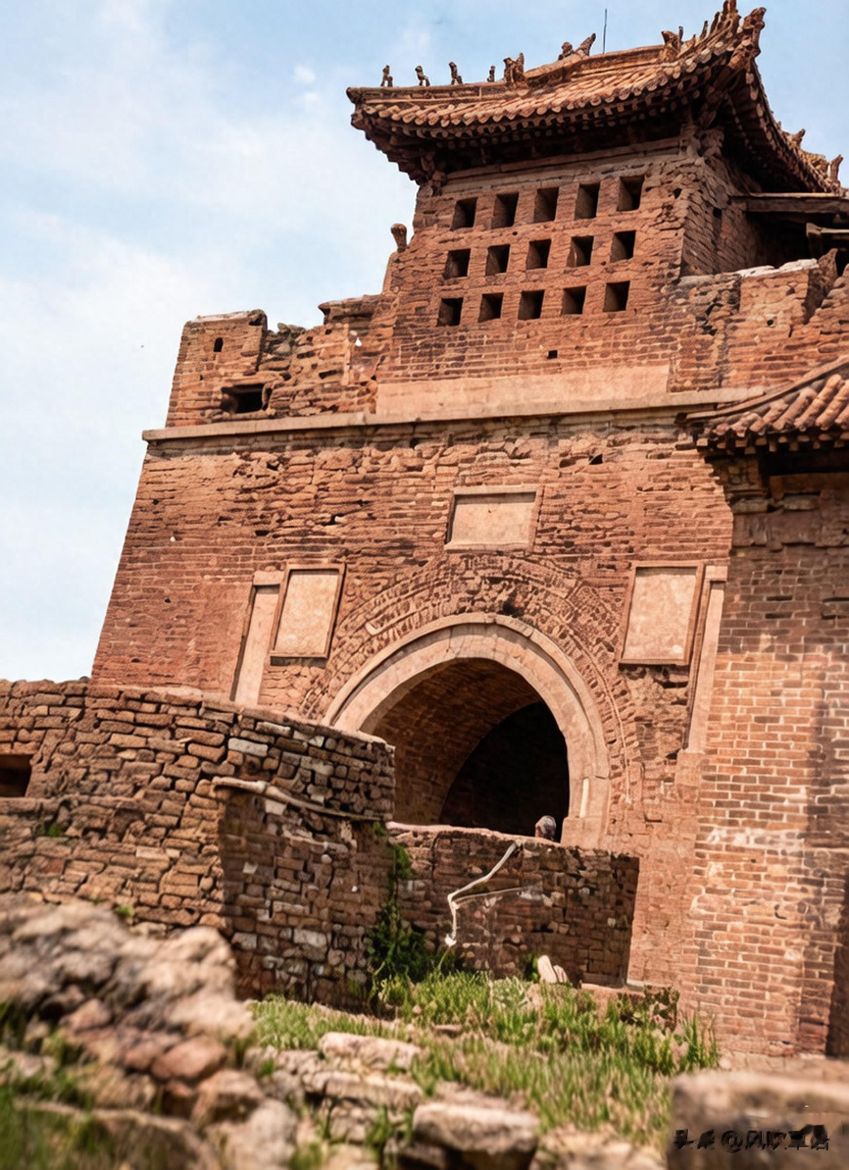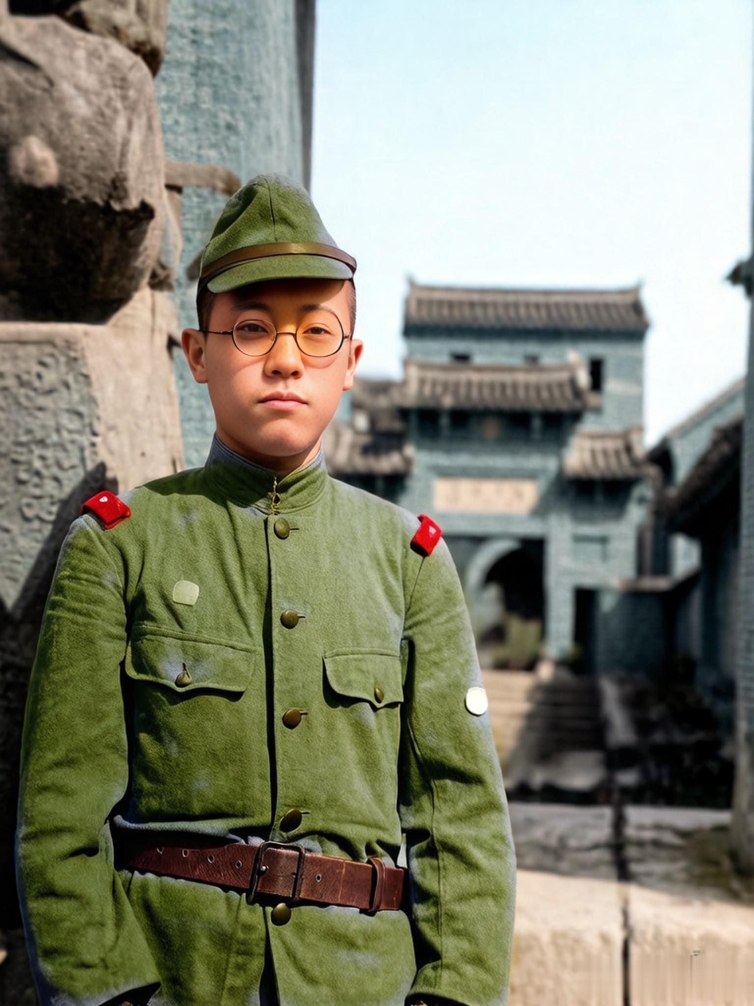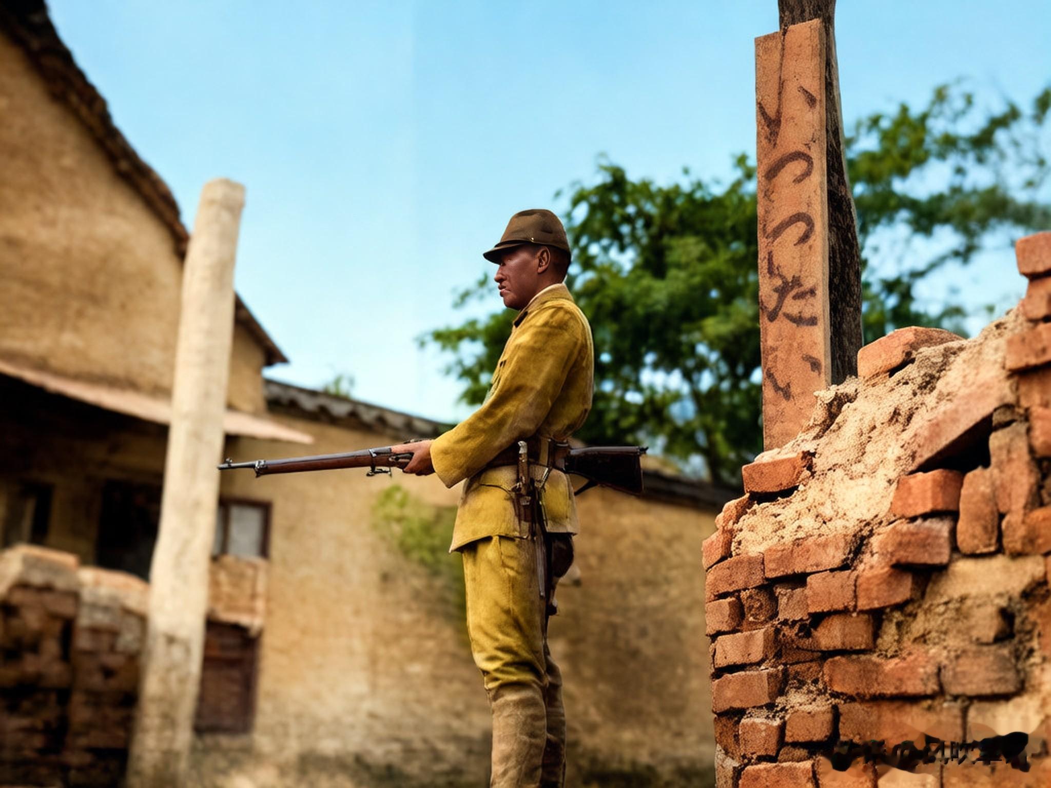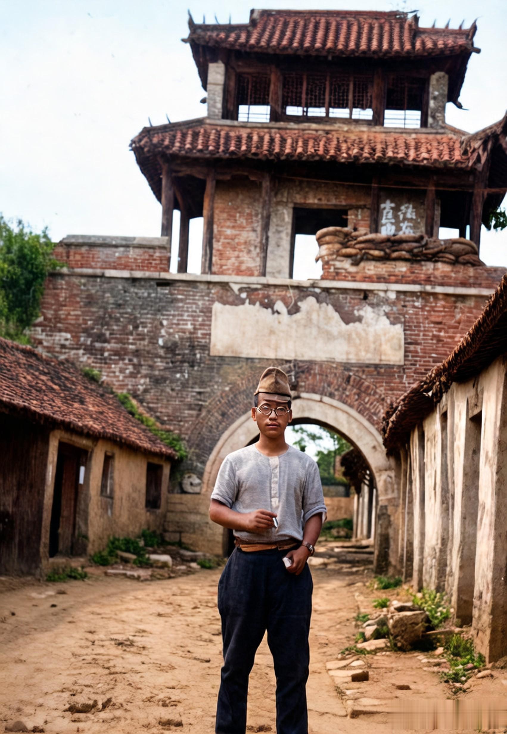 站在城门前街道的一个鬼子兵,手里拿着纸烟和烟盒,戴着眼镜。在城门上,还可以看到当年中国守军遗留的工事。曾经人来人往的繁华之地,如今变得空无一人。