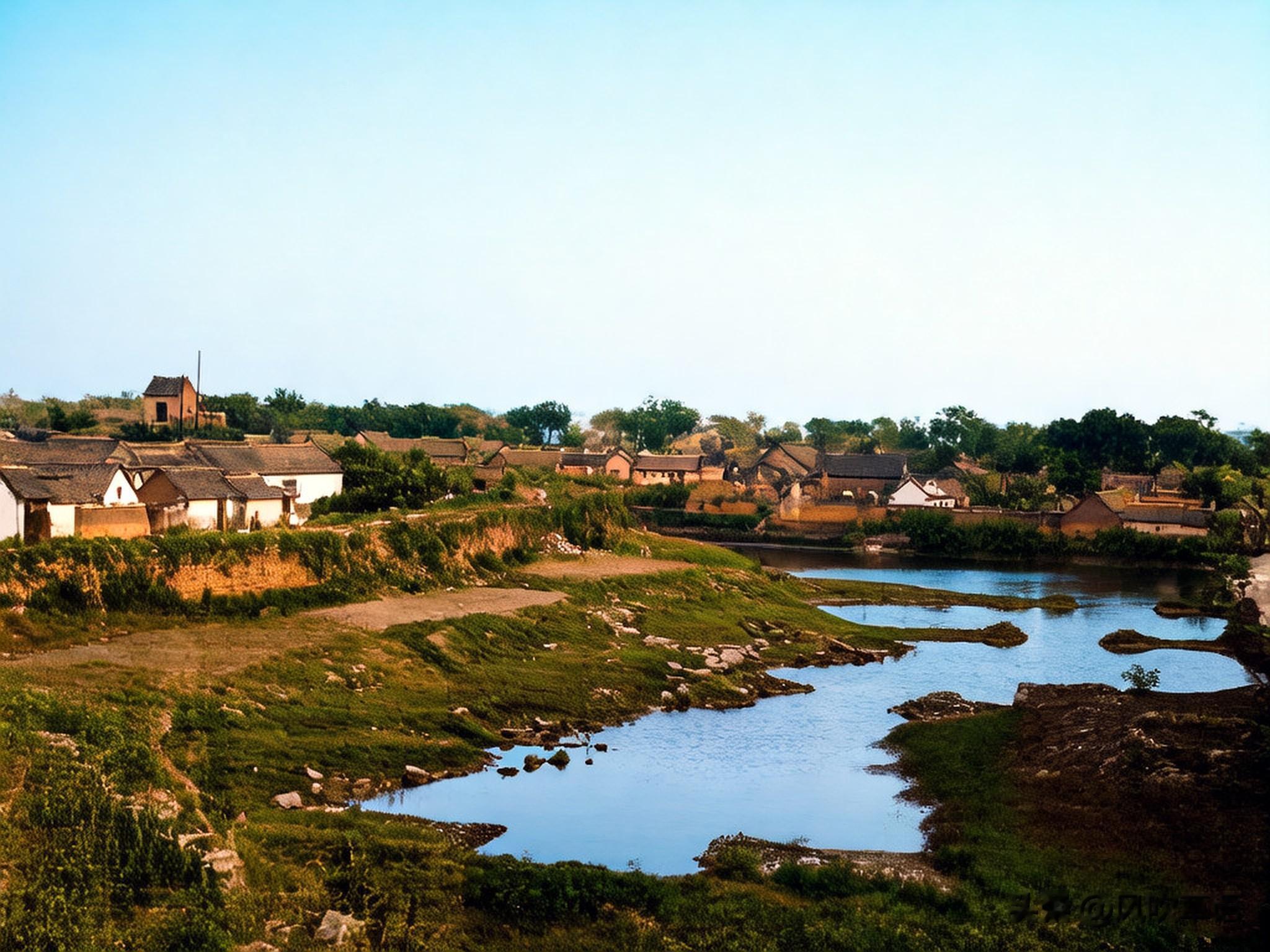 日本摄影师站在莒县古城南门外, 朝向东南方向拍摄的一张照片,画面中可见护城河、城墙以及城内的民居。