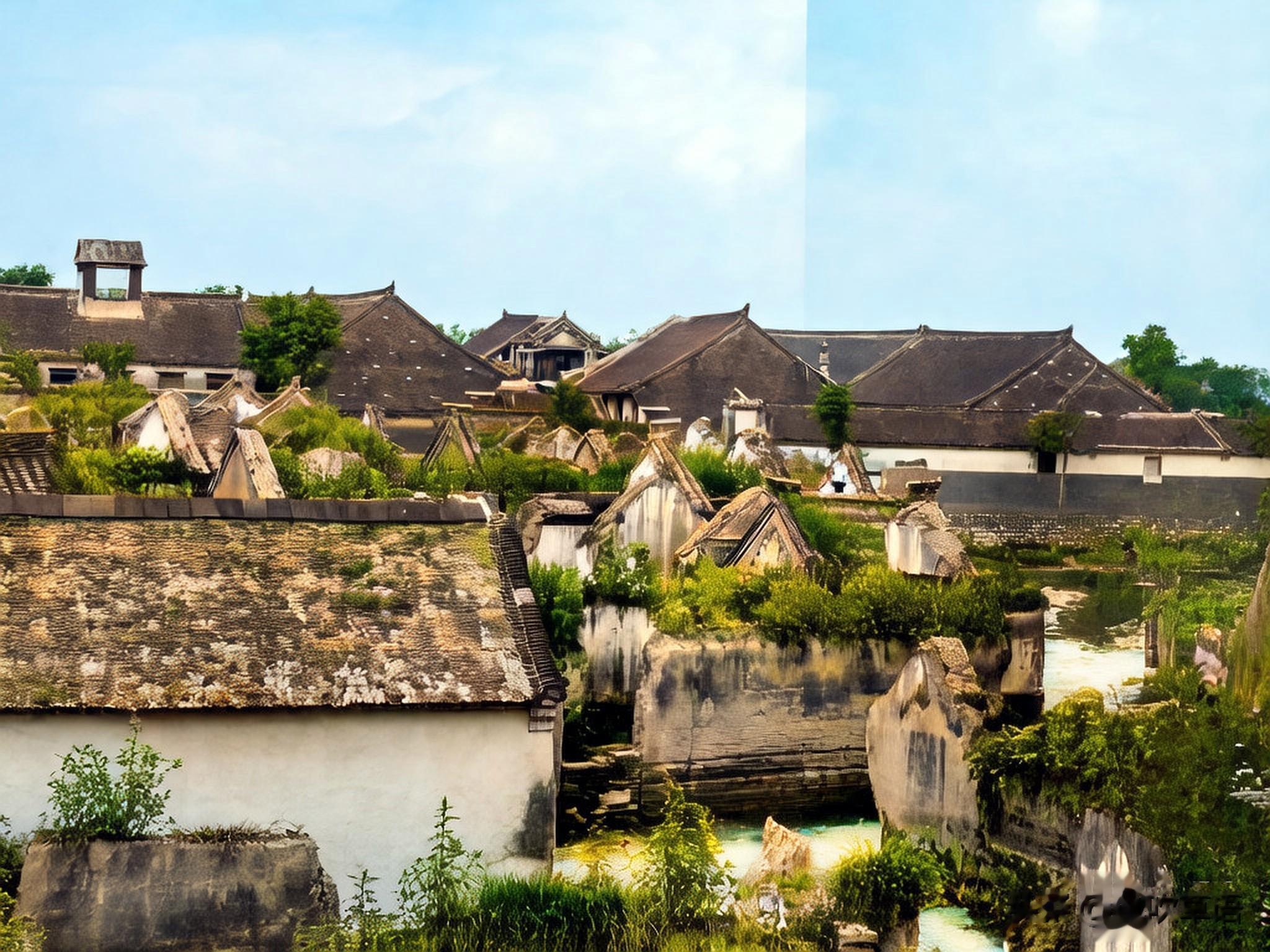 莒县南关的景象,画面中呈现的是密集的房屋。近景是被日军攻城时轰塌的民居建筑,此时,原本房间位置因为荒废已经长满了野草。