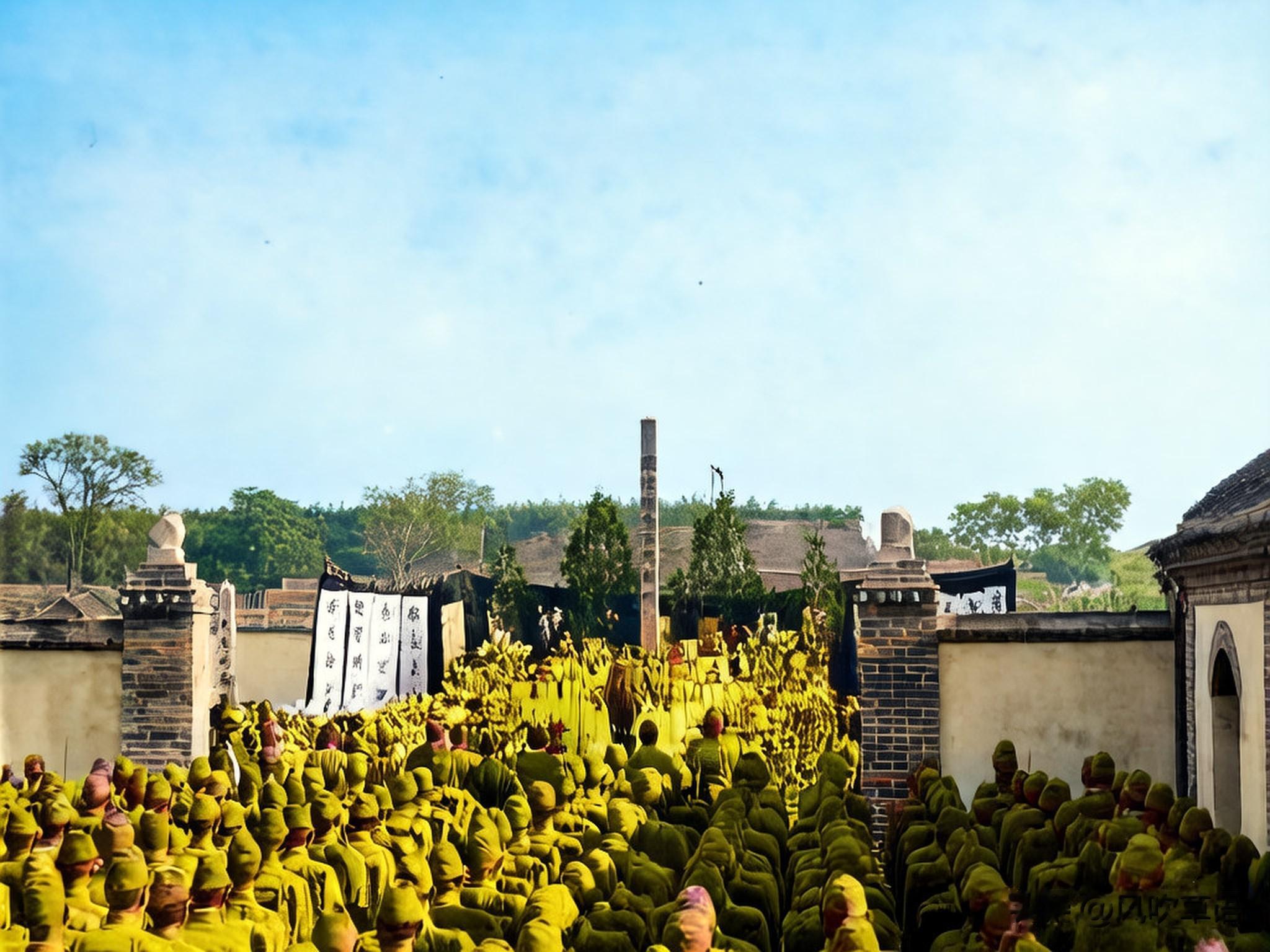 莒县城内,全副武装的日本士兵列队站立,前方是日本人刚刚竖起的一根方木,被称为“合同墓碑”(众多鬼子的合葬墓碑)。此时,全体日军正在进行所谓的“合祭祀”。