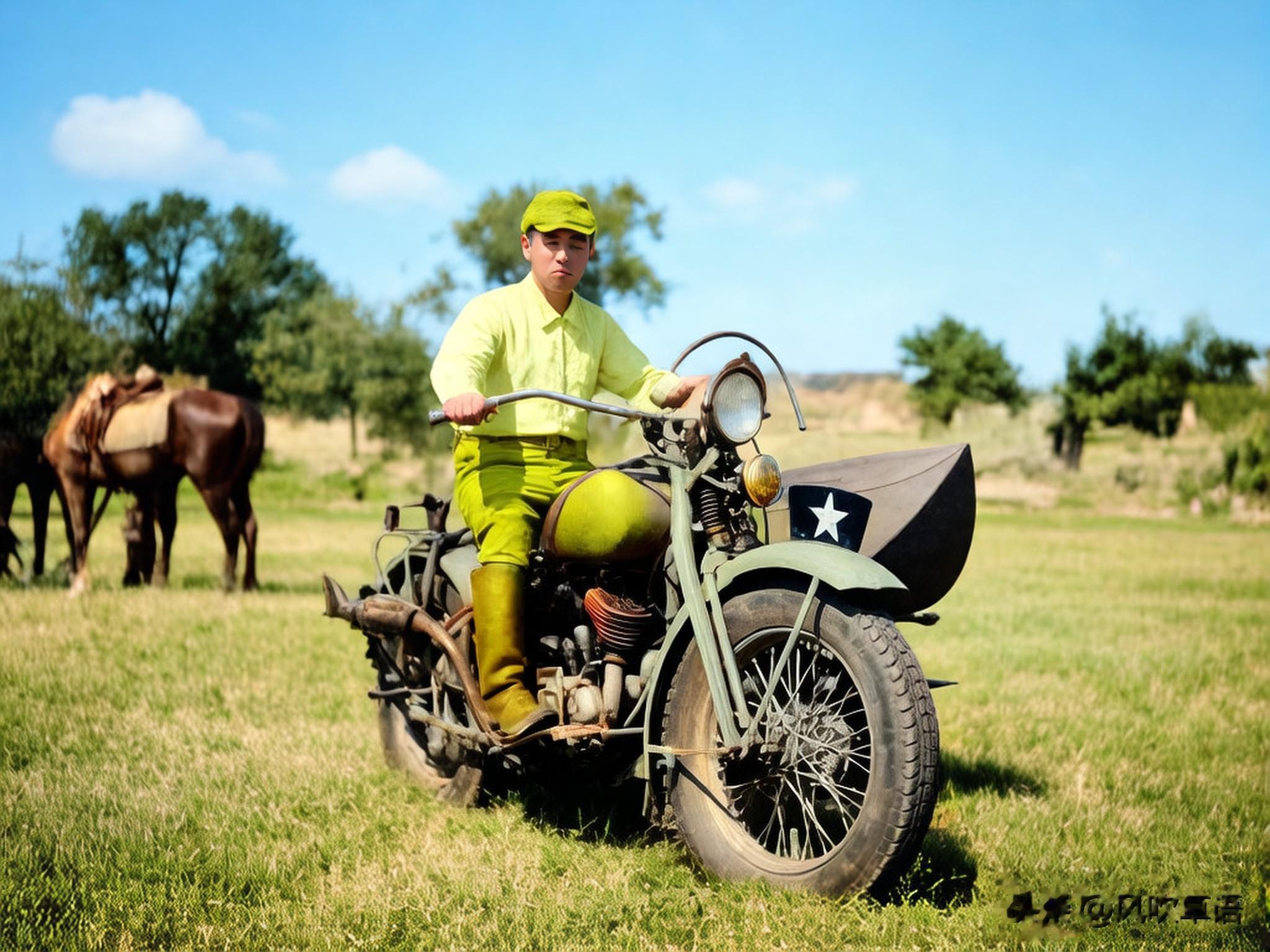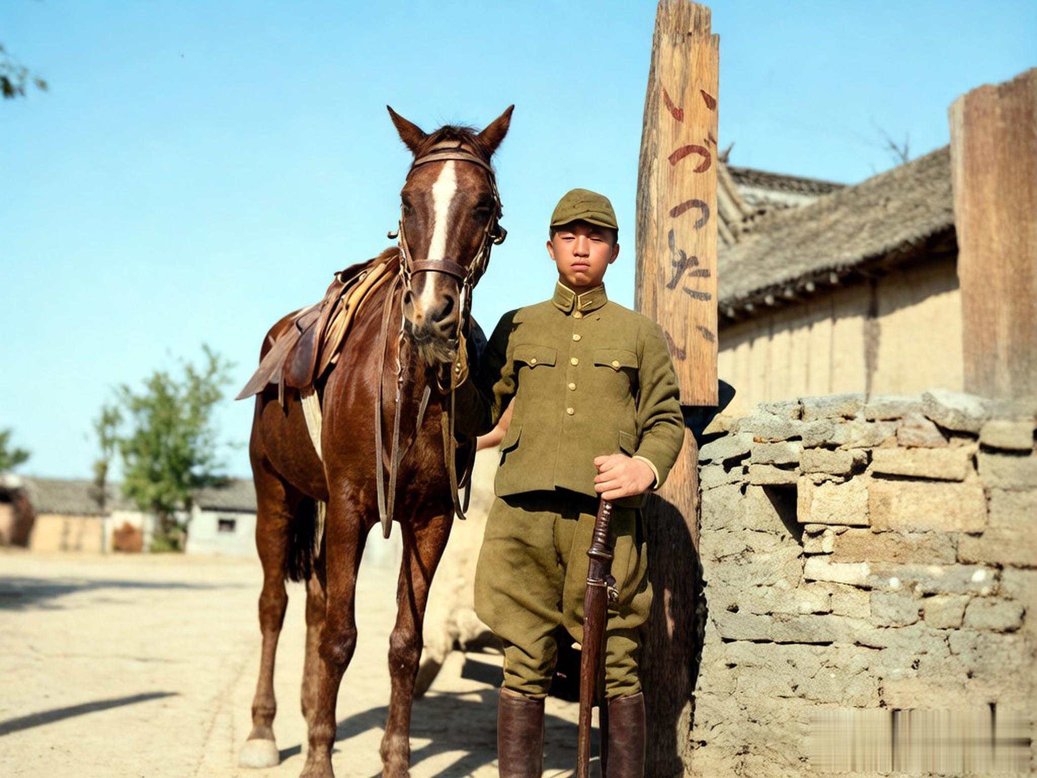 莒县城外,一个日本士兵骑在军用摩托车上,车上有一枚明显的五星标志。不远处立着一匹东洋马,远处隐约可见一些民居建筑。