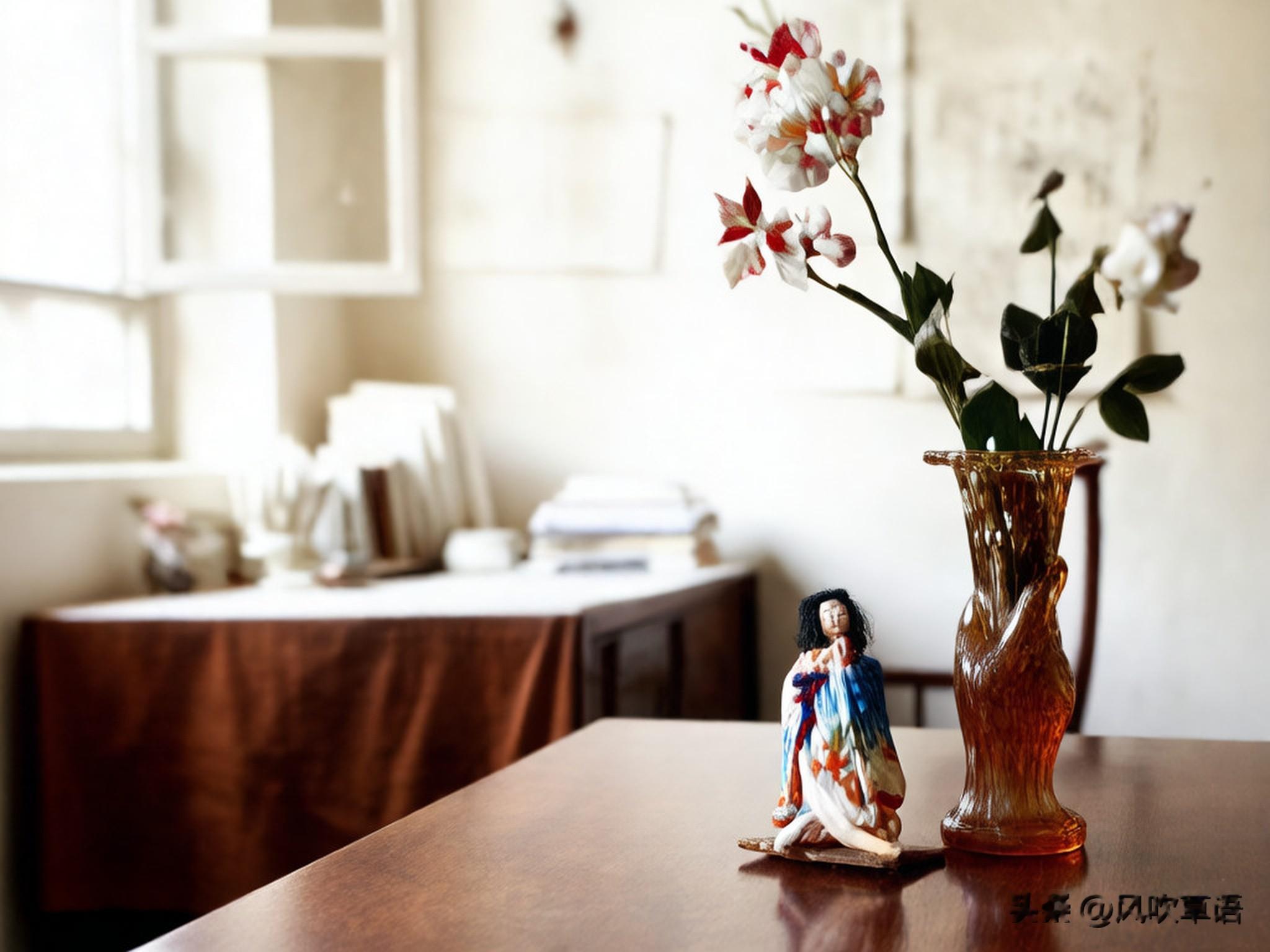 井筒中队长办公室内的景象,桌子上铺着台布,上面摆放着一只插花的花瓶和一个日本人偶。