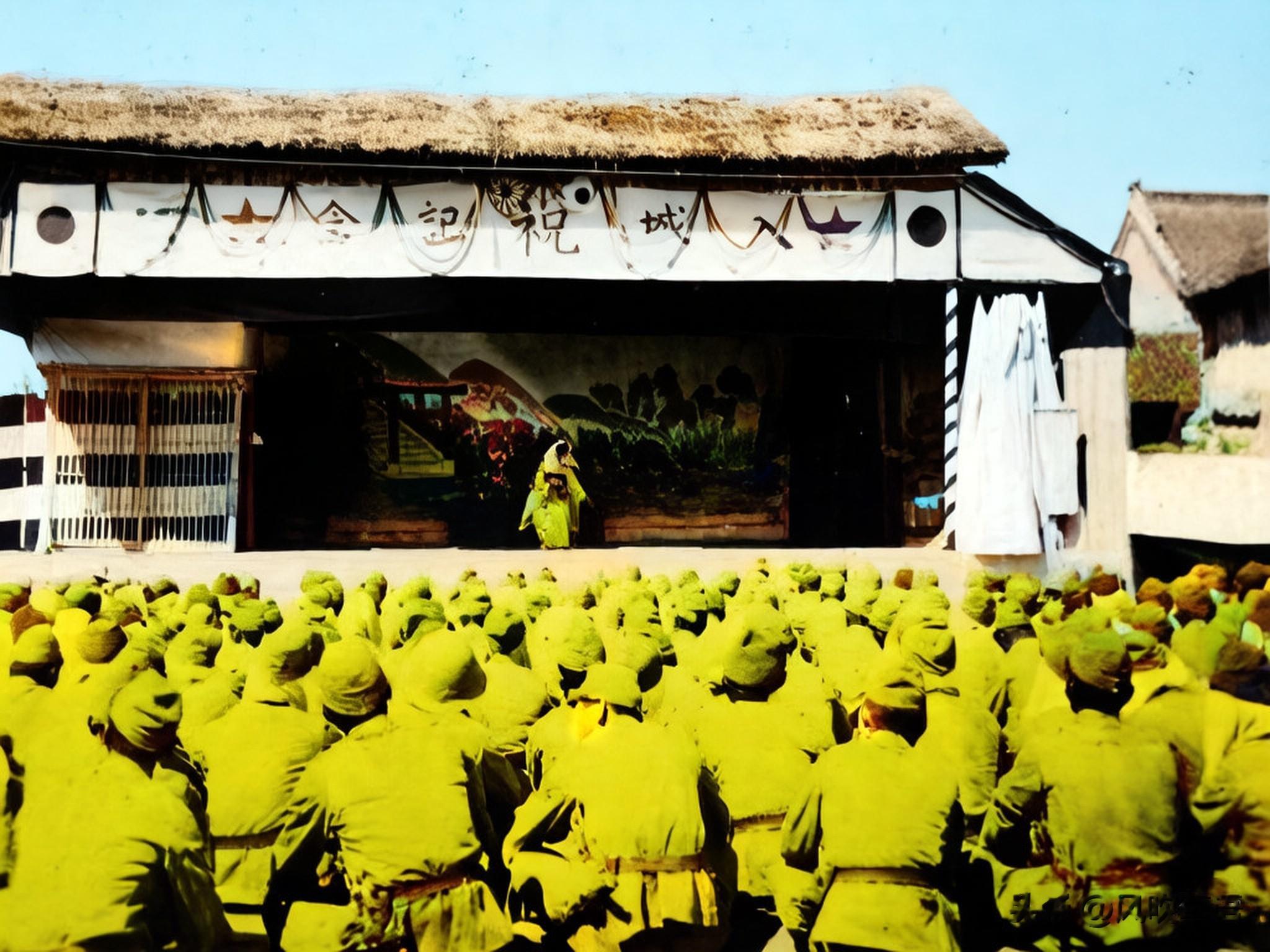 1939年2月23日,日本人为纪念莒县入城一周年而举行的文艺表演,台上一名日本艺伎正在表演独舞,大批士兵坐在台下观看。