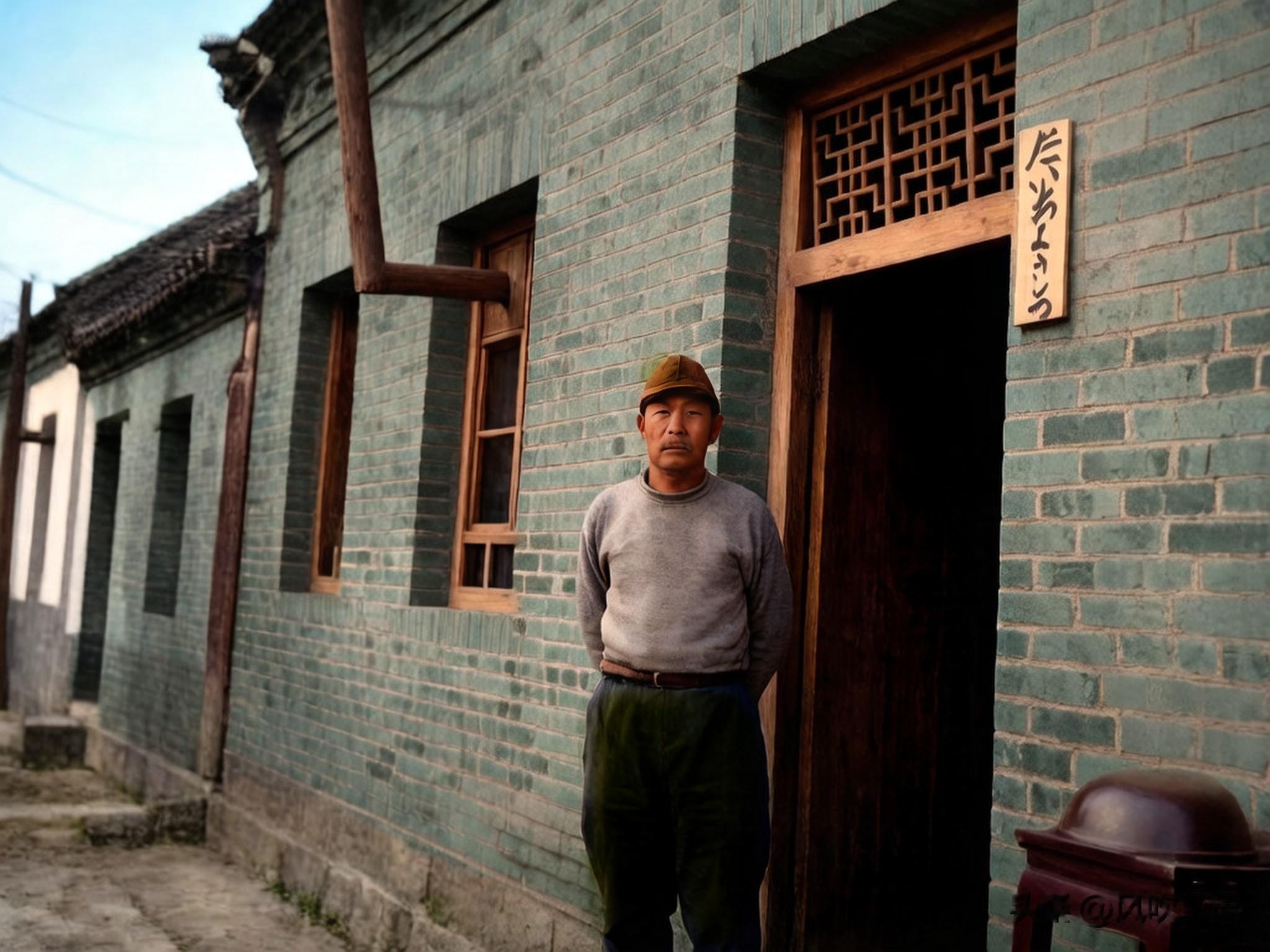 井筒中队驻地院内的景象,一个叫山本的一等兵站在队长室的门前,靠门的墙壁上挂着一块写有日文的木牌。