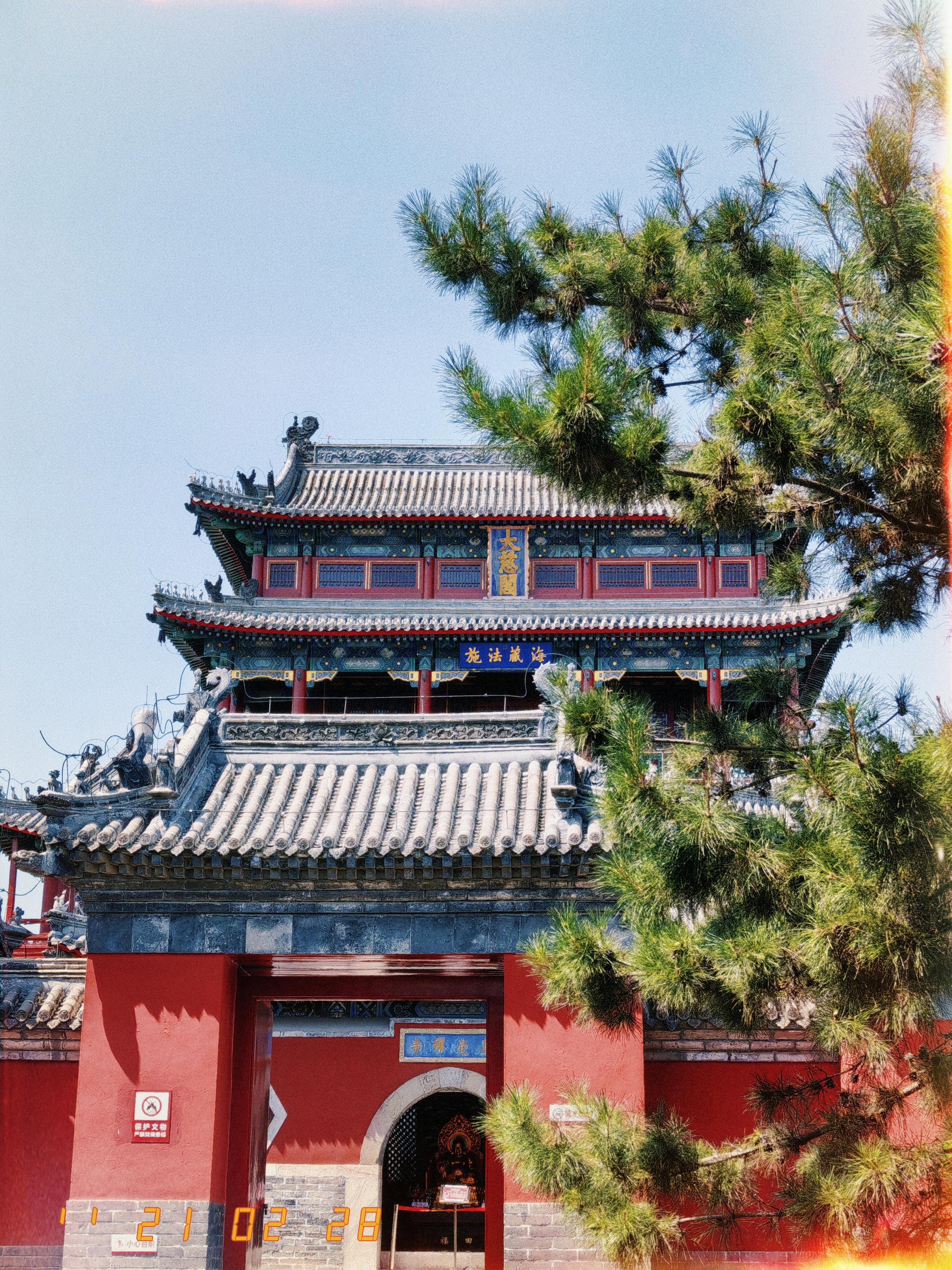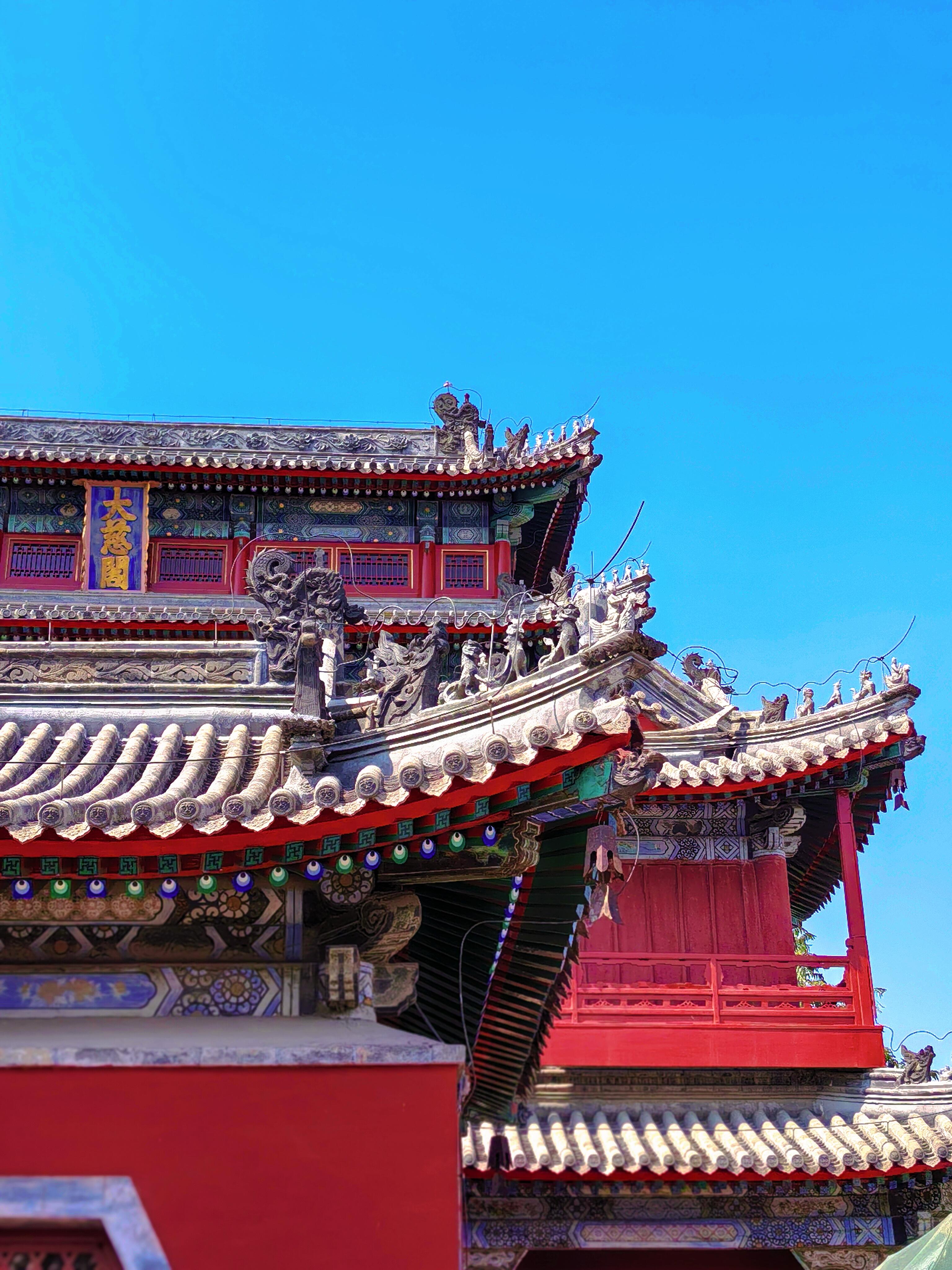没能进阁里细看,成了那次保定之行最大的遗憾,可光是站在阁外仰望,就足够让人惊叹。大慈阁的主体建筑有三层,重檐歇山布瓦顶层层叠叠,从下往上看,每层的檐角都微微上翘,像被风吹起的衣角,既不张扬又满是灵动。最底下一层的廊柱又粗又直,支撑着整座阁楼的重量,柱身上隐约能看到斑驳的彩绘,虽辨不清具体图案,却为这古朴的木构添了几分亮色。据说这座阁楼是元代蔡国公张柔在1227年建的,算下来已有近八百年历史,可仰头看那木构的咬合处,依旧严丝合缝,仿佛时光在它身上格外手下留情。
