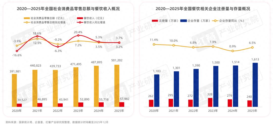 01.行业进入存量博弈时代,产业认知决定品牌生死线2025年,我国消费市场总体呈现稳中向好的发展态势。国家统计局数据显示,2025年全国社会消费品零售总额为501,202亿元,较2024年同比增长3.7%,餐饮收入为57,982亿元,同比增长3.2%,市场需求韧性依旧强劲。