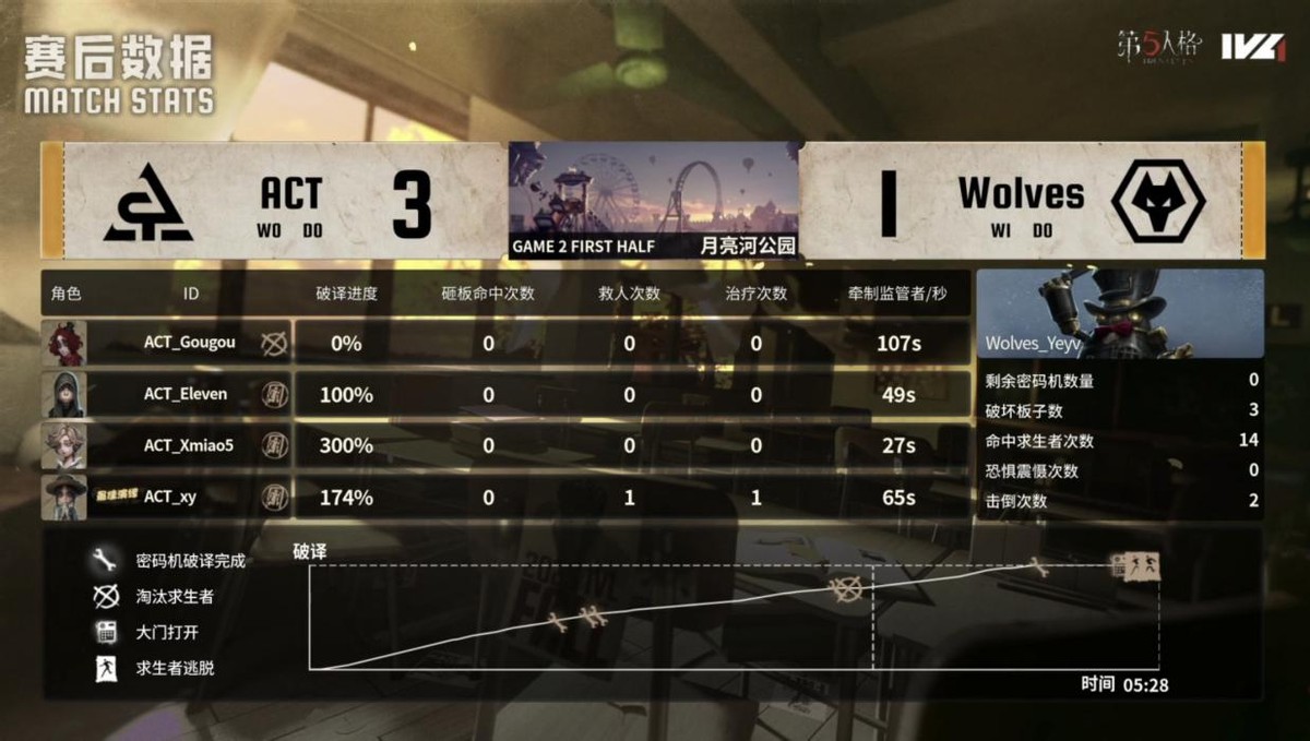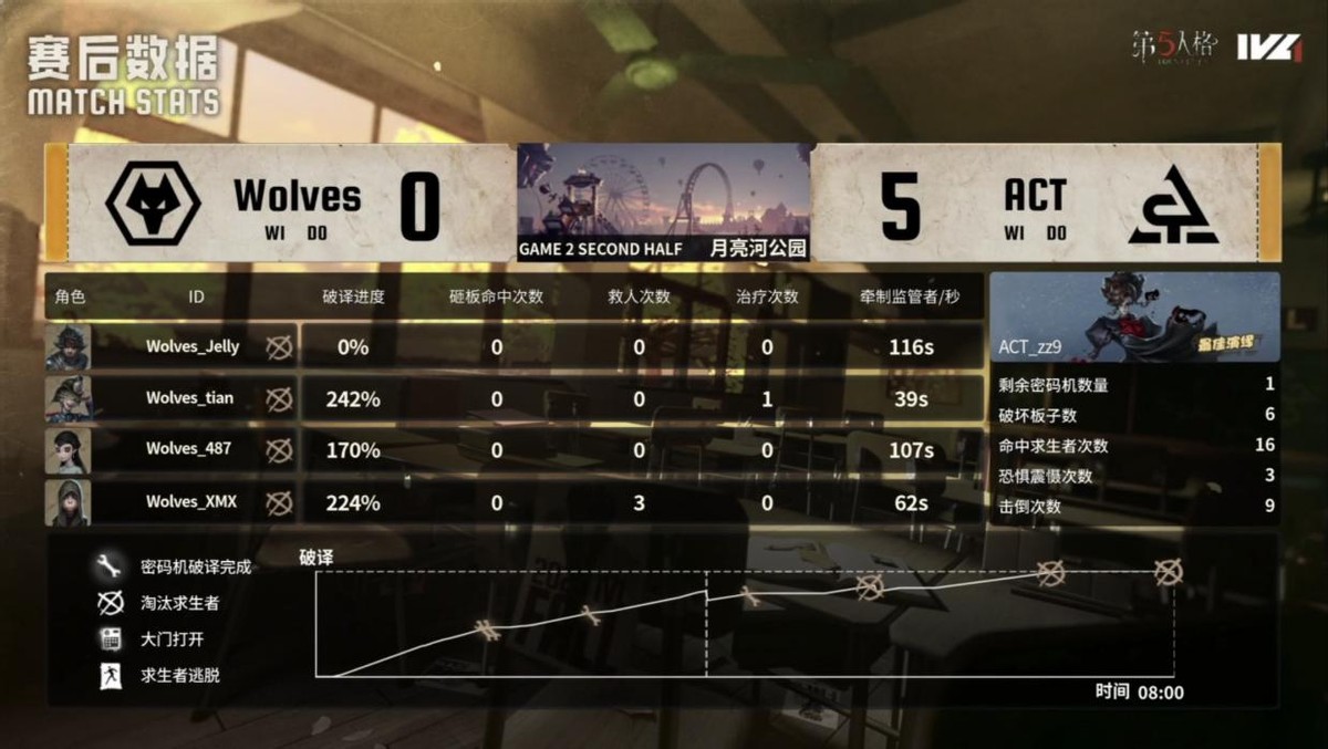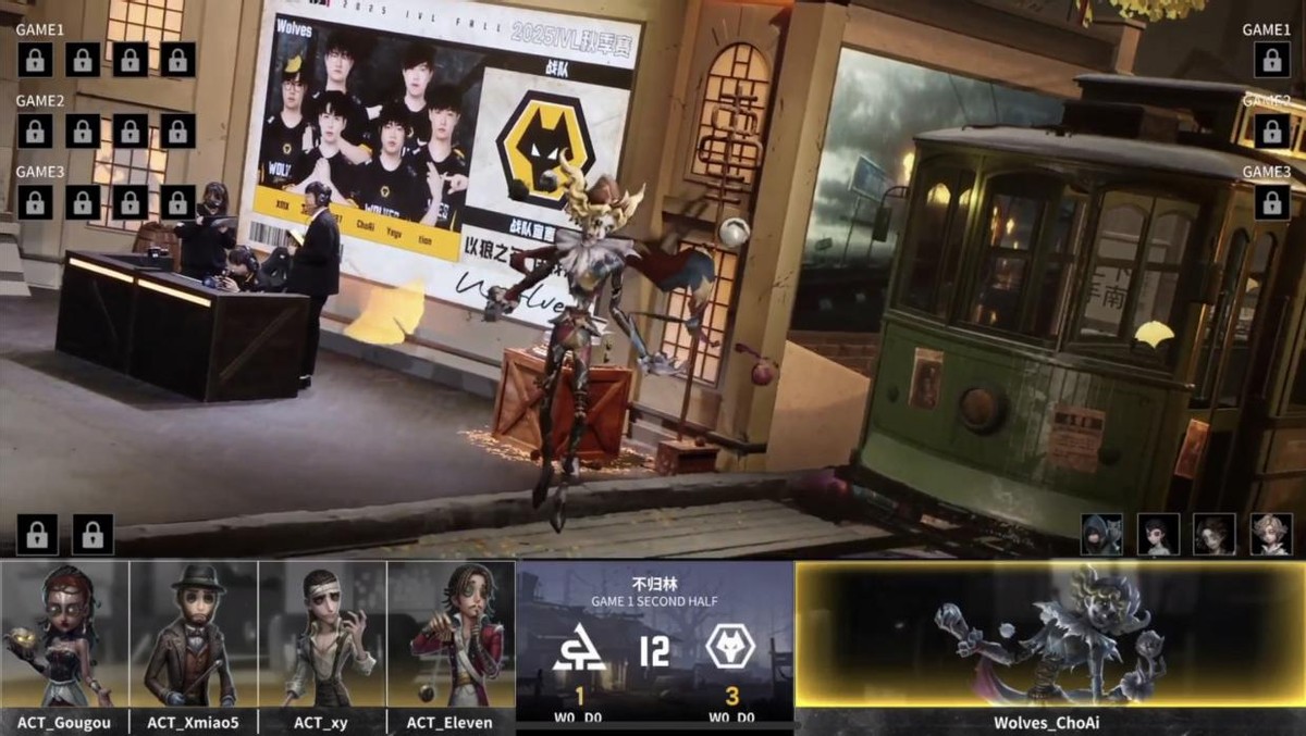 2025年10月31日,第五人格IVL秋季赛常规赛第五周第一日的比赛开始,在当天的比赛中,ACT以1胜1平1负的战绩(15:10)击败了成都Wolves,以下是本场比赛战报。