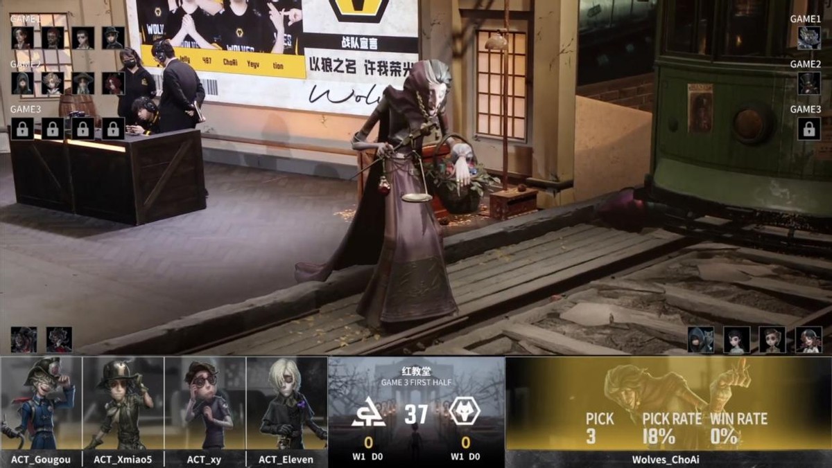 ACT的求生者选择了火灾调查员、勘探员、幸运儿、守墓人(BAN歌剧演员、“跛脚羊”);成都Wolves的监管者ChoAi选择了杂货商。(BAN先知、古董商、空军、拉拉队员)