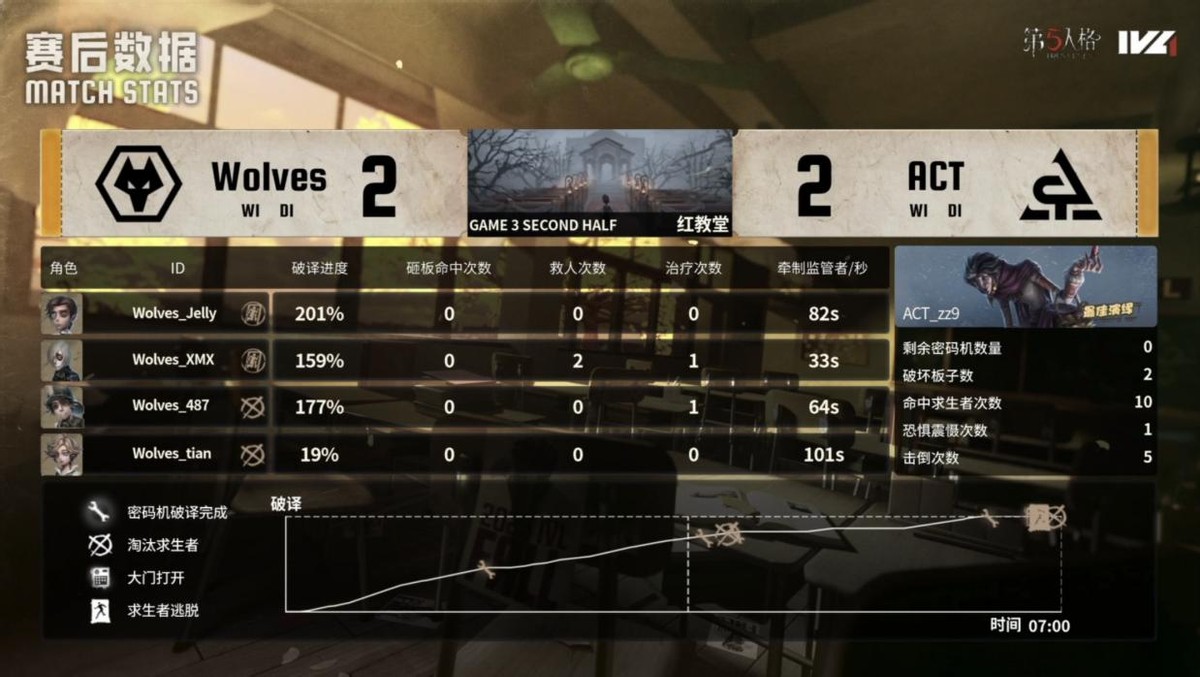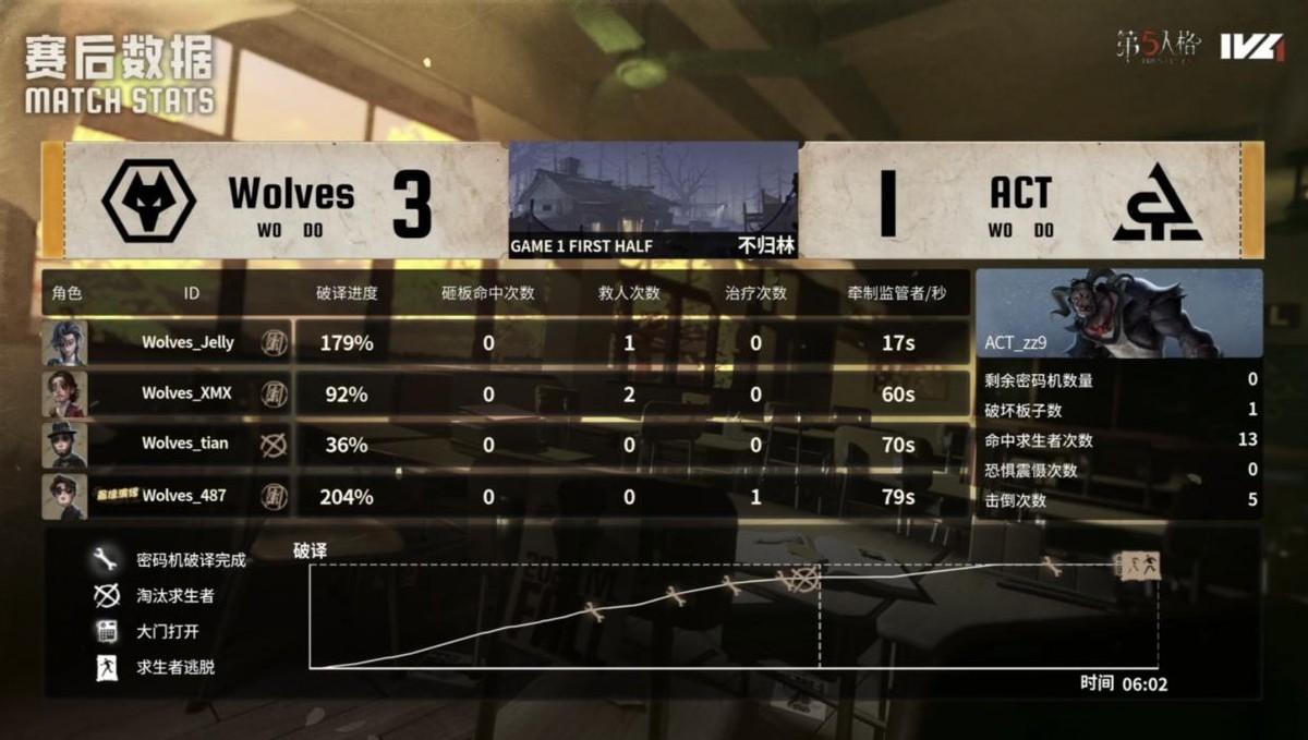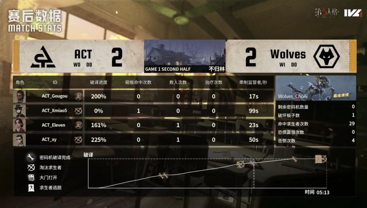 成都Wolves的求生者选择了幸运儿、魔术师、“骑士”、大副;ACT的监管者zz9选择了“跛脚羊”。(BAN先知、教授、木偶师、守墓人)