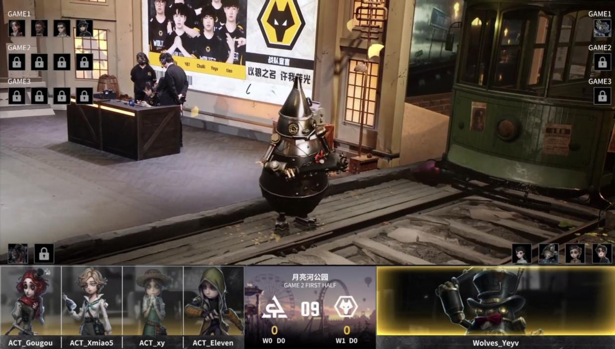 ACT的求生者选择了哭泣小丑、园丁、佣兵、气象学家(BAN“跛脚羊”);成都Wolves的监管者Yeyv选择了邦邦。(BAN古董商、火灾调查员、空军、幸运儿)