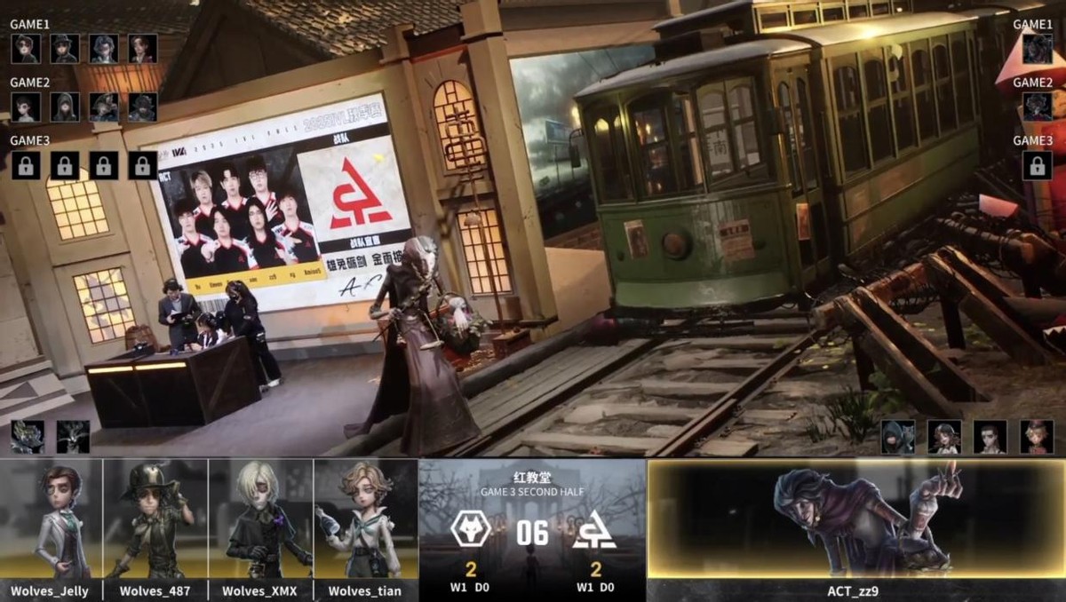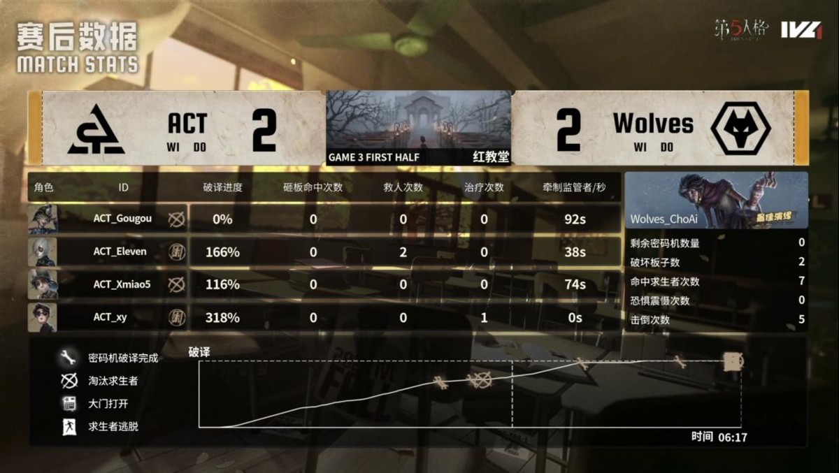 ACT的求生者选择了咒术师、魔术师、教授、大副;成都Wolves的监管者ChoAi选择了“喧嚣”。(BAN先知、古董商、木偶师、气象学家)