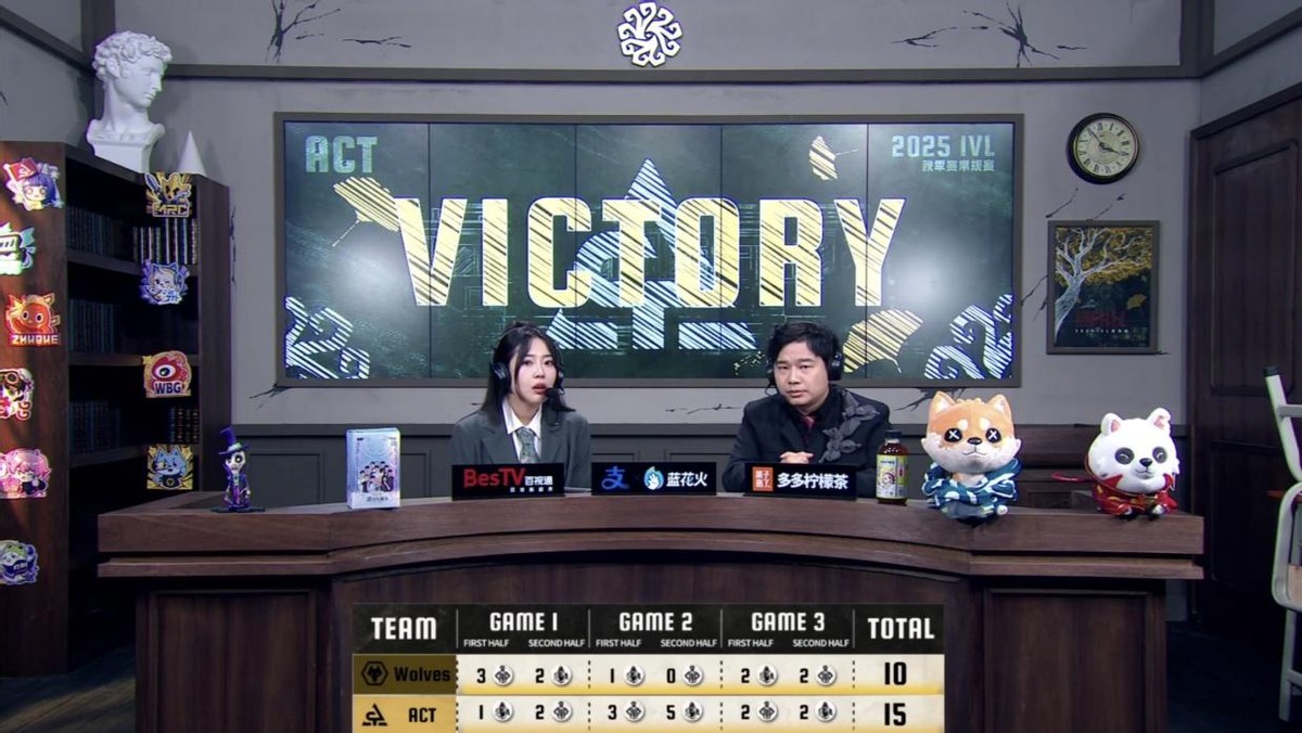 最终,ACT以1胜1平1负(15:10)的比分击败成都Wolves,获得本场比赛的胜利。