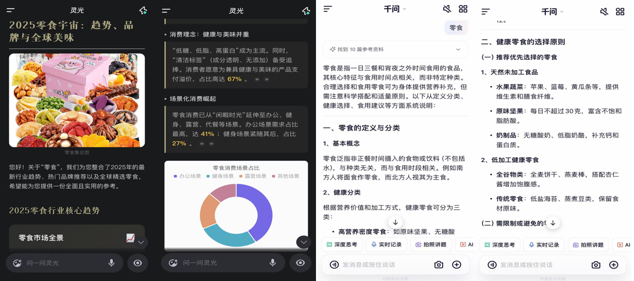 新识研究所经过对“灵光”和“千问”实测发现,灵光似乎倾向于图文结合的方式进行回答,总结能力和罗列信息更有立体感、更简洁一点,有种以PPT形式去呈现内容,易于用户的使用和理解,例如输入“零食”关键词,优先调取今年数据讲解行业趋势,而后会提到具体的品牌名称与对比。