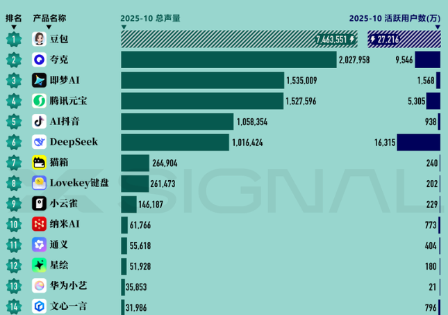 据新京报AI研究院与Xsignal联合发布的AI应用榜单排名显示,截止10月份,声量前三名为豆包、夸克、即梦AI,月活前三名为豆包、DeepSeek、夸克。