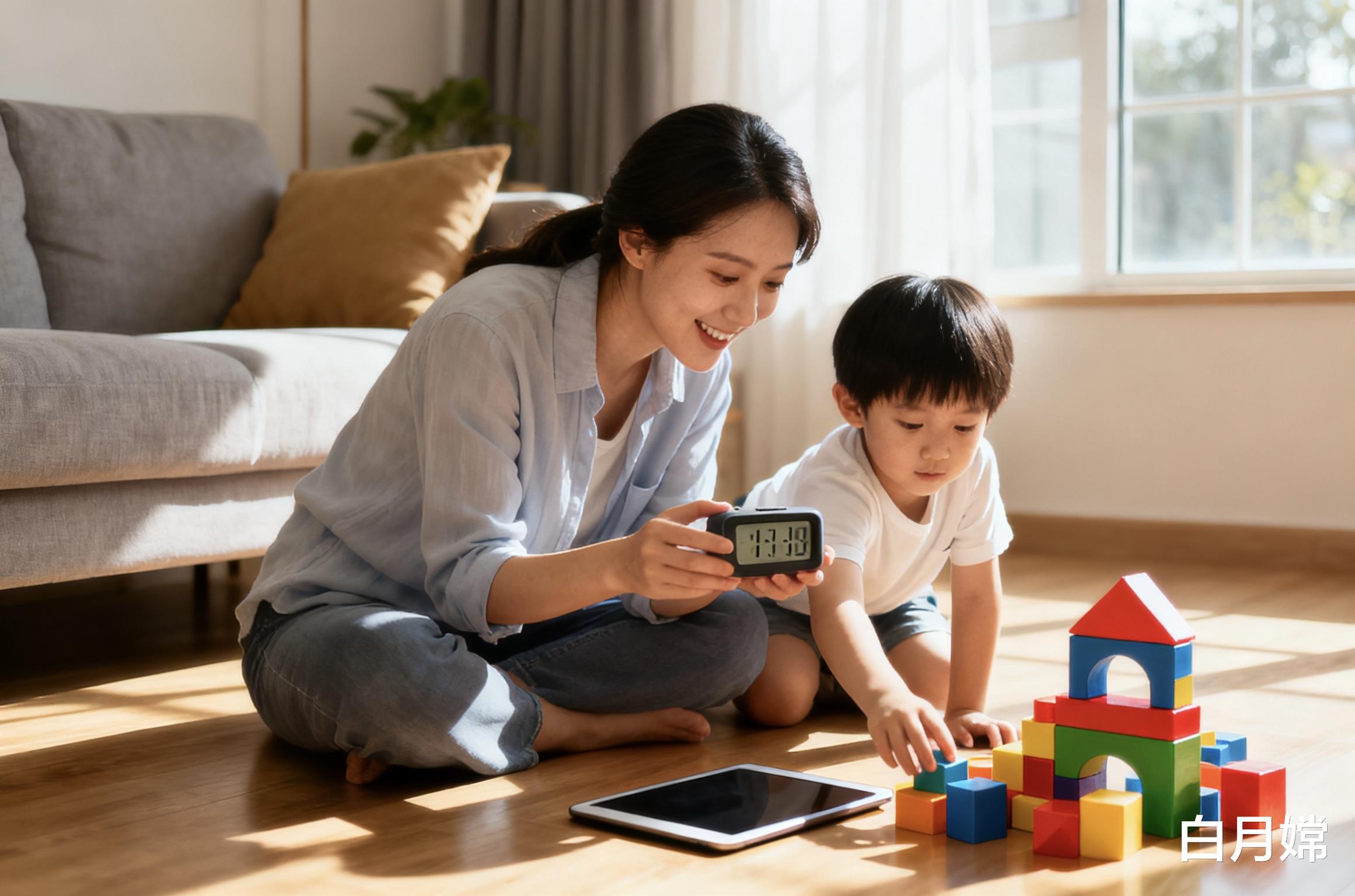 用计时器可视化:每天固定15-20分钟屏幕时间,提前把计时器摆在孩子面前,说清“指针指到这里,我们就去玩你最爱的积木”,减少突然终止的抵触;