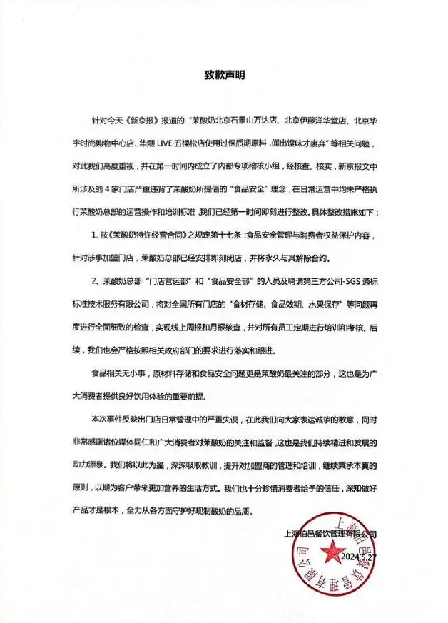 声明中写道:对此我们高度重视,并在第一时间内成立了内部专项稽核小组,经核查、核实,记者所提到的4家门店严重违背了茉酸奶所提倡的“食品安全”理念,在日常运营中均未严格执行茉酸奶总部的运营操作和培训标准。针对涉事加盟门店,茉酸奶总部已经安排即刻闭店,并将永久与其解除合约。同时,茉酸奶总部将对全国所有门店的“食材存储、食品效期、水果保存”等问题再度进行全面细致的检查,并对所有员工定期进行培训和考核。