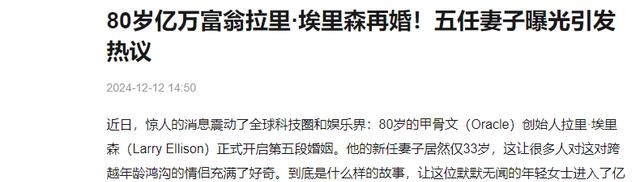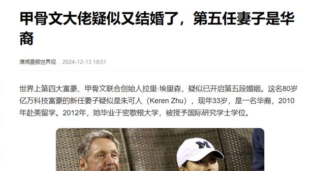 《甲骨文大佬疑似又结婚了,第五任妻子是华裔》潇湘晨报世界观,2024-12-13发布