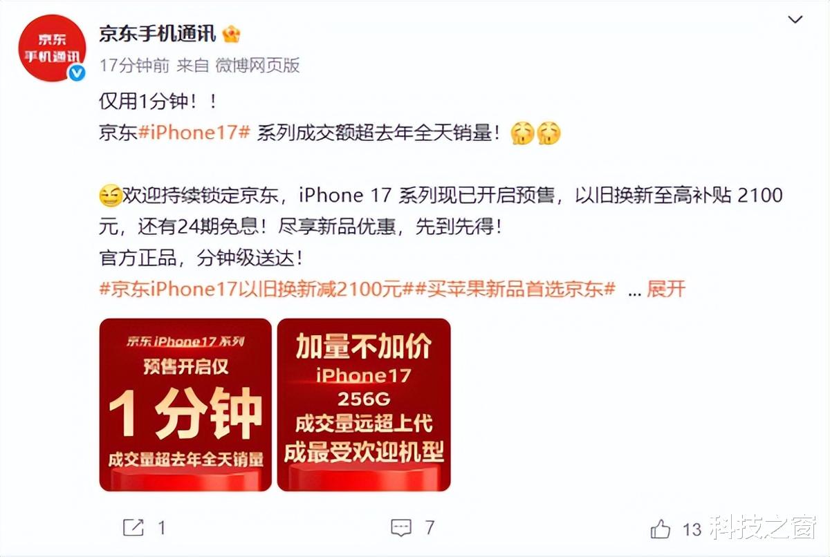 从市场表现来看,iPhone 17 系列发布后,标准版凭借较大的升级幅度,开售一分钟交易额就超过去年全天销量。