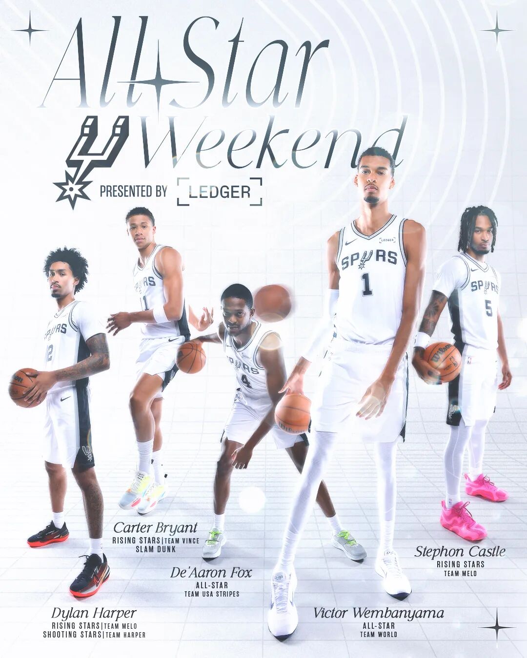 今年的全明星,马刺一共五个球员参加(教练还有米奇),其中,文班亚马和福克斯参加正赛,卡斯尔和哈珀参加新秀赛(哈珀还参加了投篮之星大赛),以及,不可忽略的,卡特布莱恩特也参加了新秀赛和扣篮大赛。