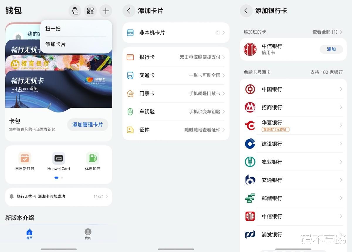 如果你想开通华为支付,也简单:打开华为钱包APP,右上角有个加号,点进去先选添加卡片再选银行卡,连卡号都不需要输,三五分钟就能搞定。绑好的卡在鸿蒙生态所有场景均适用,比如在华为商城、华为音乐、各种元服务上支付时,收银台贴心记忆并优先推荐常用的支付方式,选择华为支付后,所有操作均在当前页面流畅进行,体验一气呵成。