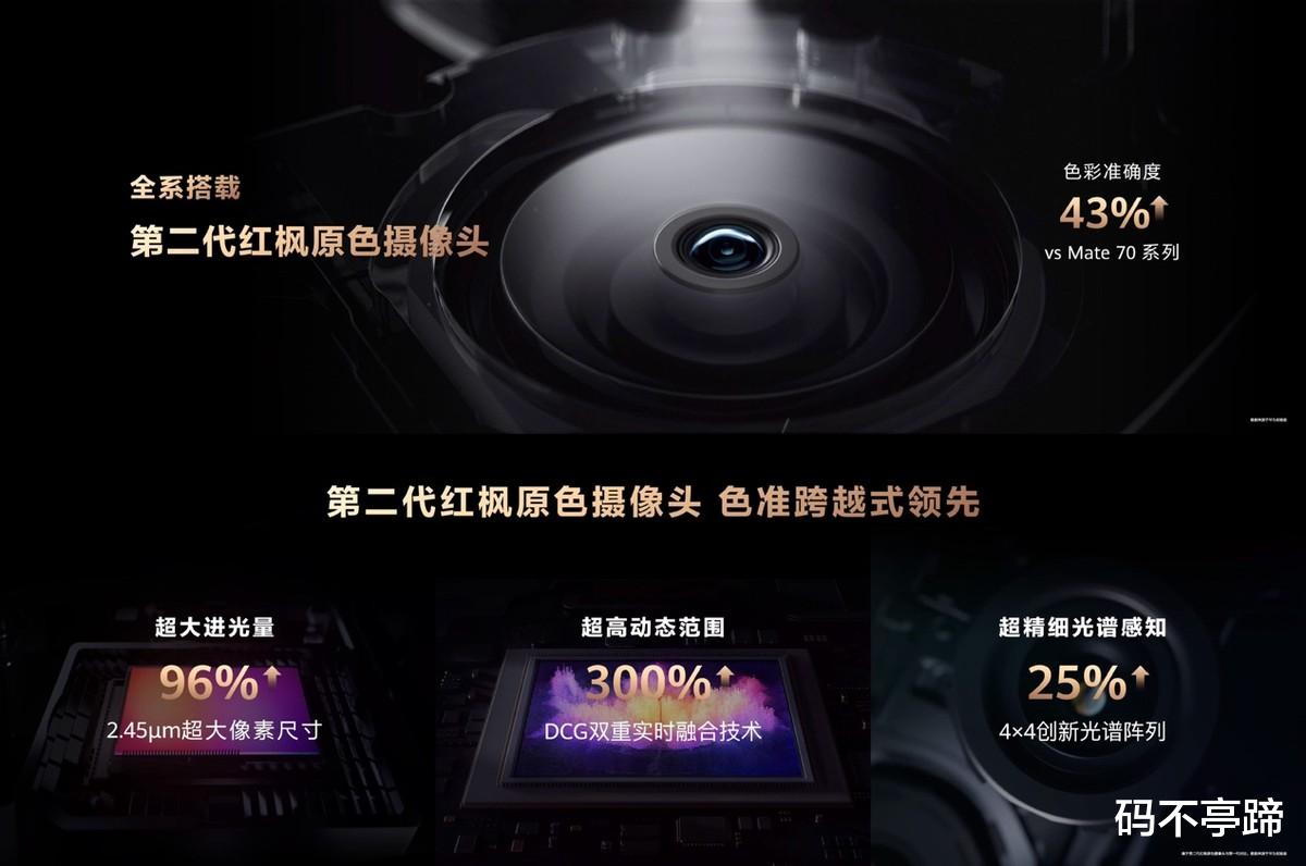 影像方面,Mate80升级成第二代红枫原色摄像头,Pro Max版本不仅动态范围提升300%,17.5EV超高动态主摄听起来就吓人,而且四个镜头涵盖了广角到超长焦的全焦段。屏幕方面,Pro Max的双层OLED灵珑屏,把亮度提升到8000nits,大太阳底下看手机也不用找树荫。此外还有全系6米IP68加IP69防水,第二代昆仑玻璃耐摔能力提升20倍,Mate80系列在防护这块依旧很稳。