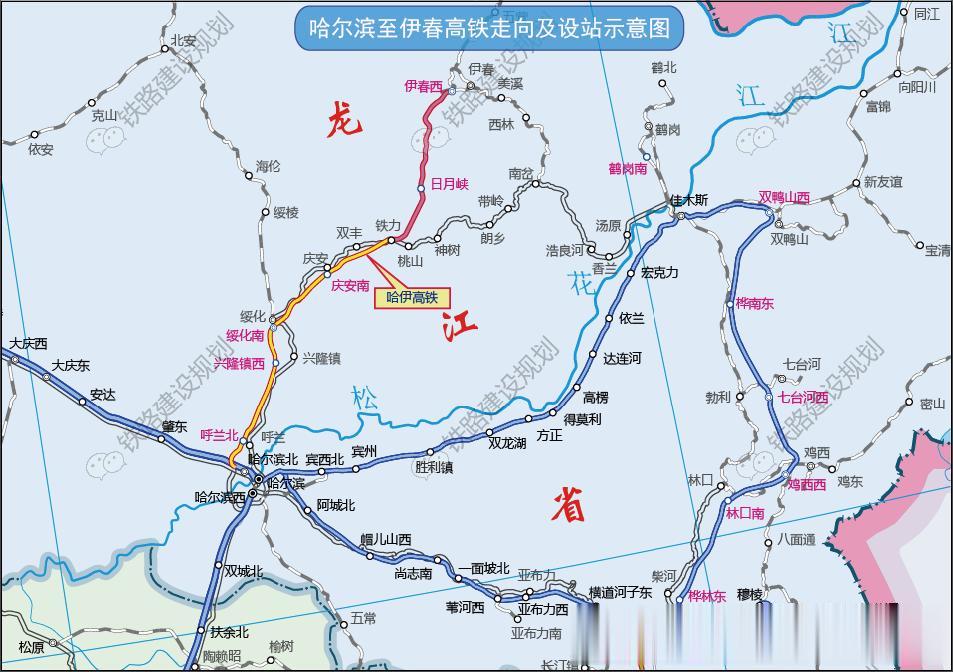 线路起自黑龙江省哈尔滨市,途经绥化市,终至伊春市,正线全长318公里,设计时速250公里,由哈尔滨至铁力段、铁力至伊春段组成。目前,铁力至伊春段已完成铺轨。