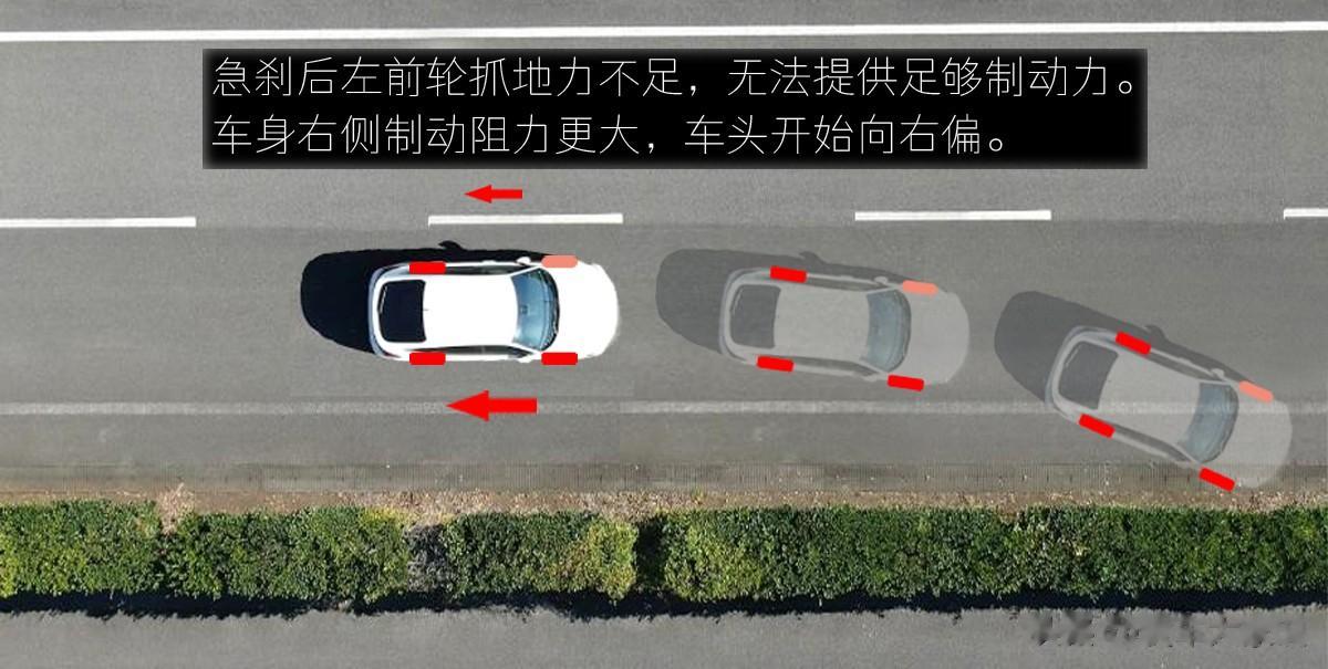 原因很简单,咱就假设左前轮爆胎吧,刹车踩下去后四个轮子同时刹车,但左前轮爆胎没抓地力。所以相当于右侧两个轮子制动,左边只有一个。车身两侧受到的阻力就不平衡了,左边小又变大,汽车肯定就开始向右打转失控了。