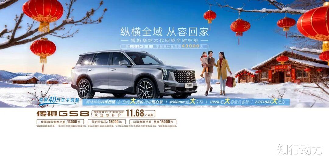 对于广大消费者来说,传祺GS8既有面子又有里子,既有可靠的品质,又有12万入手的超高性价比,无疑是购车的理想之选。开传祺GS8,载福归家,过一个热热闹闹的团圆年。