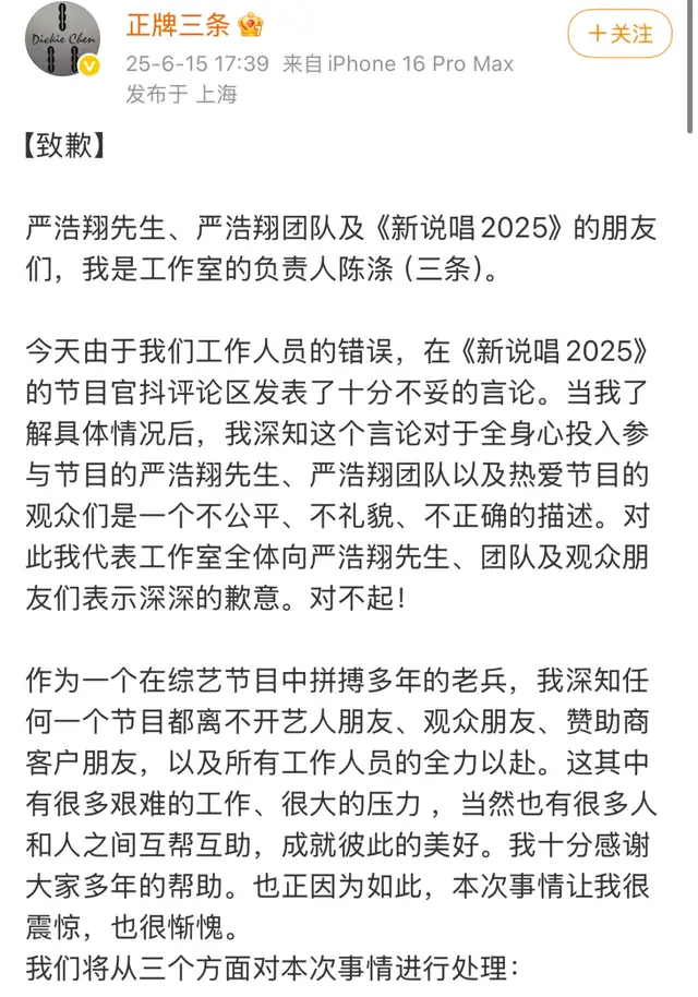 当日上午,《新说唱2025》这档综艺的官方短视频账号,在艺人严浩翔相关视频评论区发布了贬损性言论——“粉丝还是差点,这赞还是没有邓典果多,不给力”。节目组最初解释这是"实习新人误操作",但被发现此账号是由3人共同运营,未能服众。