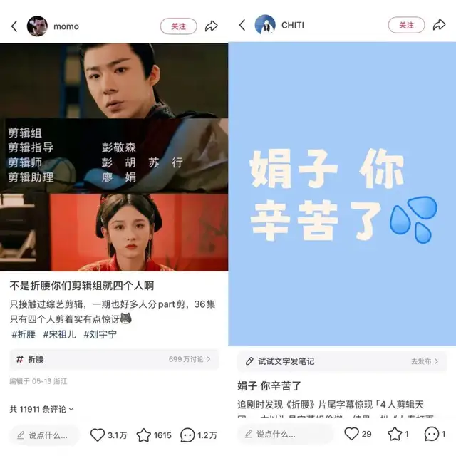 在这之前,《折腰》的“牛马剪辑助理廖娟”也曾在小红书引爆话题。