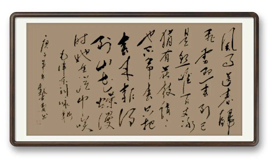 作为毛体书法传人,先生作品藏着雄浑豪迈之气韵。其草书深得毛体纵横驰骋、潇洒淋漓之精髓,线条刚劲飞动,墨色浓淡枯湿相宜,兼具怀素狂草的纵逸与毛体的豪雄,笔墨流转间,既有山河奔涌之势,又含诗意悠长之境。这份气韵,是他数十年人生积淀与艺术修行的自然流露,是胸襟气度与人文素养的笔墨投射。