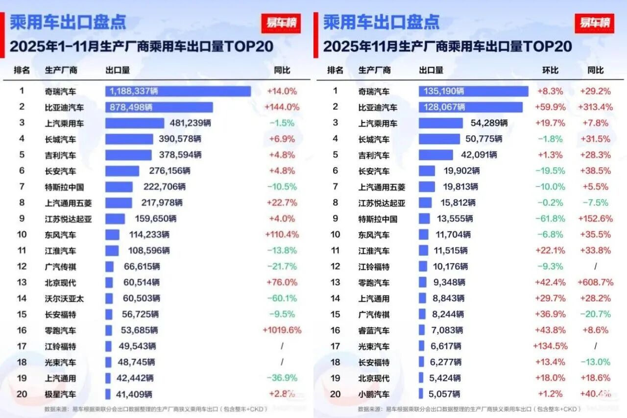 数据显示,2025年11月,比亚迪乘用车出口量达到12.8万台,同比增长高达313.4%;1—11月累计出口87.8万台,同比增长144%,已远超2024年全年出口规模。无论从绝对量级还是增长率看,比亚迪均位列中国车企出海第一梯队。而这一成绩并非“昙花一现”式的冲高,而是延续了过去数年稳定增长的趋势,显示出极强的可持续性。