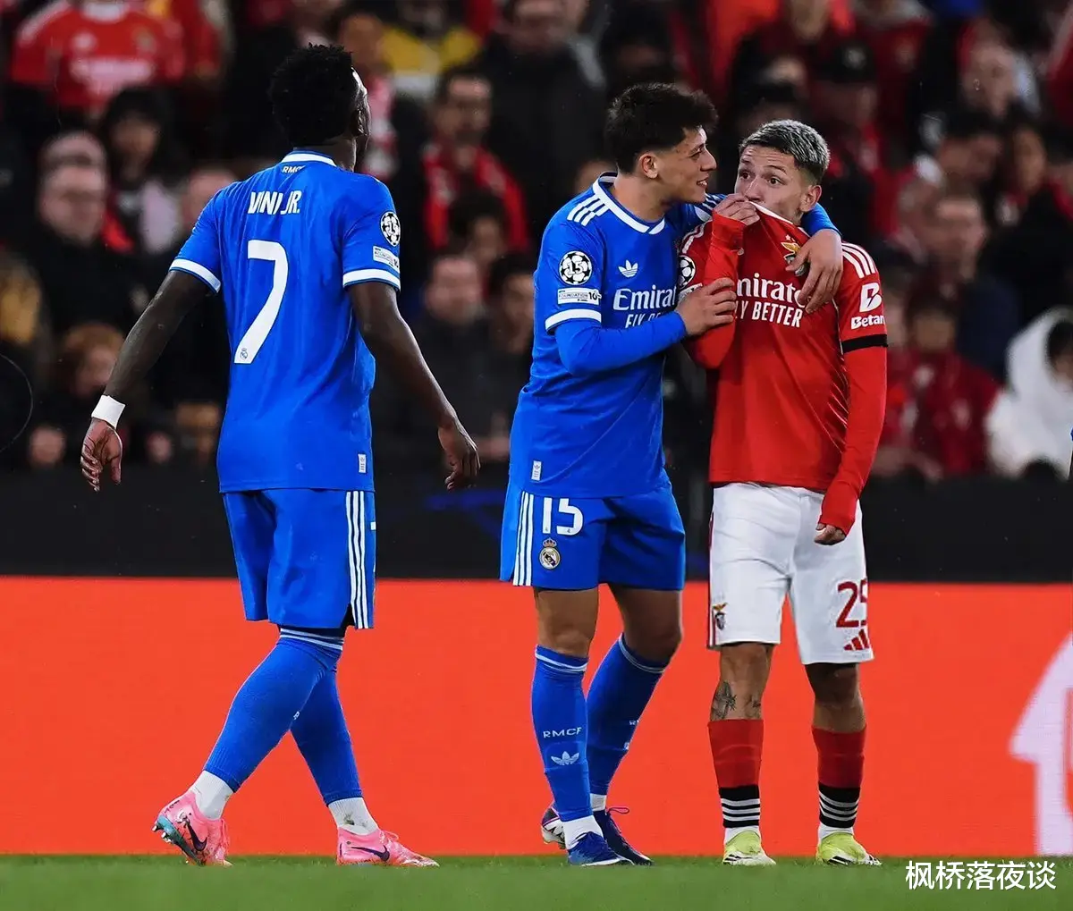 更荒诞的剧情还在上演:补时阶段,阿根廷世界杯冠军成员奥塔门迪竟然向维尼修斯亮出了自己的冠军纹身,两人相视而笑——这是挑衅?是嘲讽?还是一种诡异的“尊重”?而在球员通道外,本菲卡主席鲁伊·科斯塔甚至被曝与皇马工作人员发生肢体冲突。