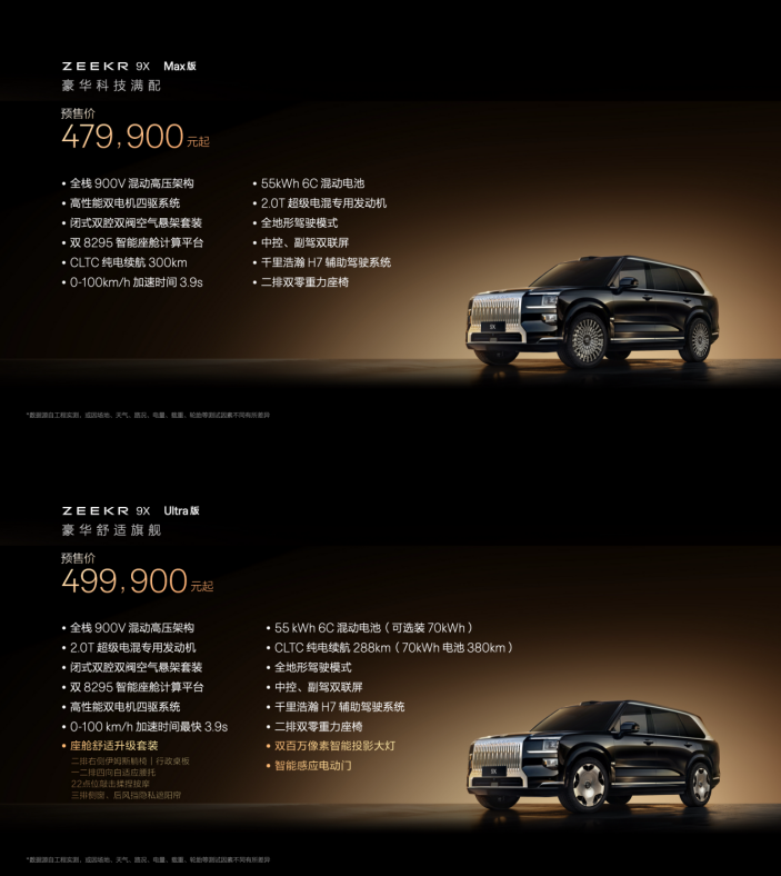 整体来看,极氪9X展现出的产品魅力让消费者无法拒绝,可能唯一纠结的就是到底选哪个版本。当前预售阶段,极氪9X共推出Max版、Ultra版和Hyper版三个版型。从各版型详情来看,极氪9X Max版配置就已经拉满,全栈900V混动高压架构、高性能双电机四驱系统、双8295智能座舱计算平台、二排双零重力座椅、闭式双腔双阀空悬等高端配置全都有,就连在宾利顶配车型上才有的Naim音响在极氪9X上也是标配;Ultra版更是在Max版基础上,搭载座舱舒适升级套装、双百万像素智能投影大灯、智能感应电动门等配置,另外还可选配70度大电池;Hyper版则是在性能和辅助驾驶方面有所提升。