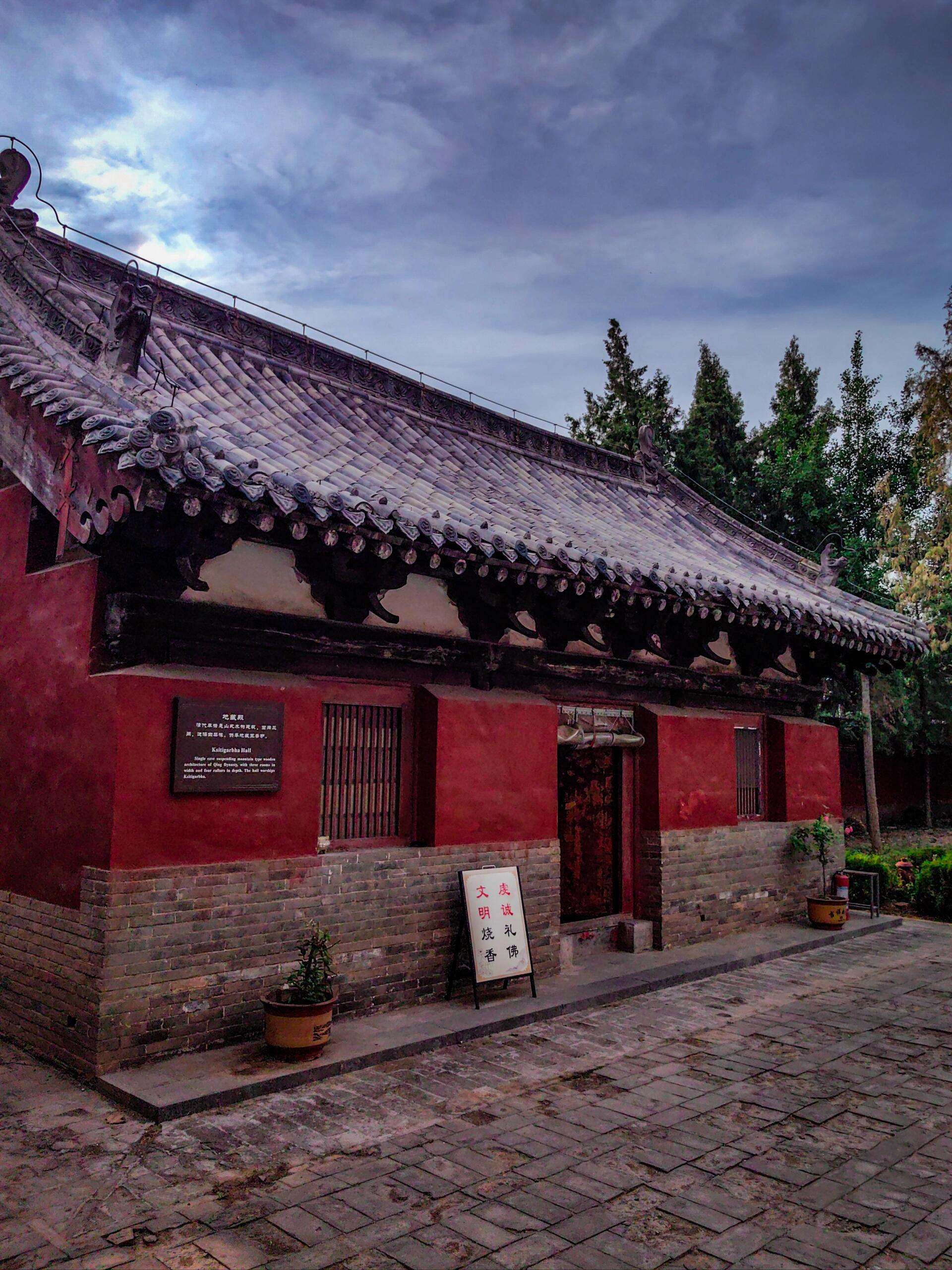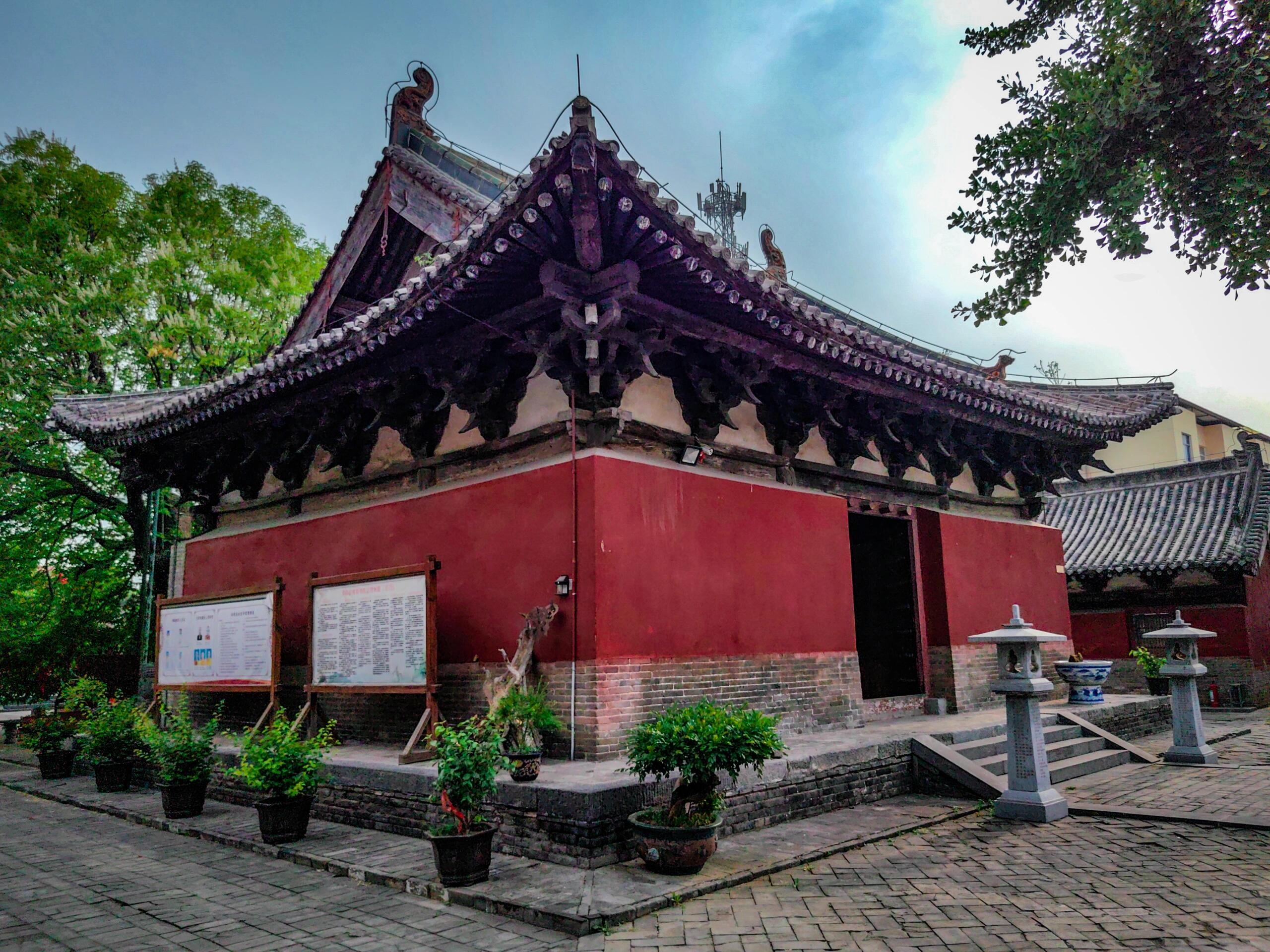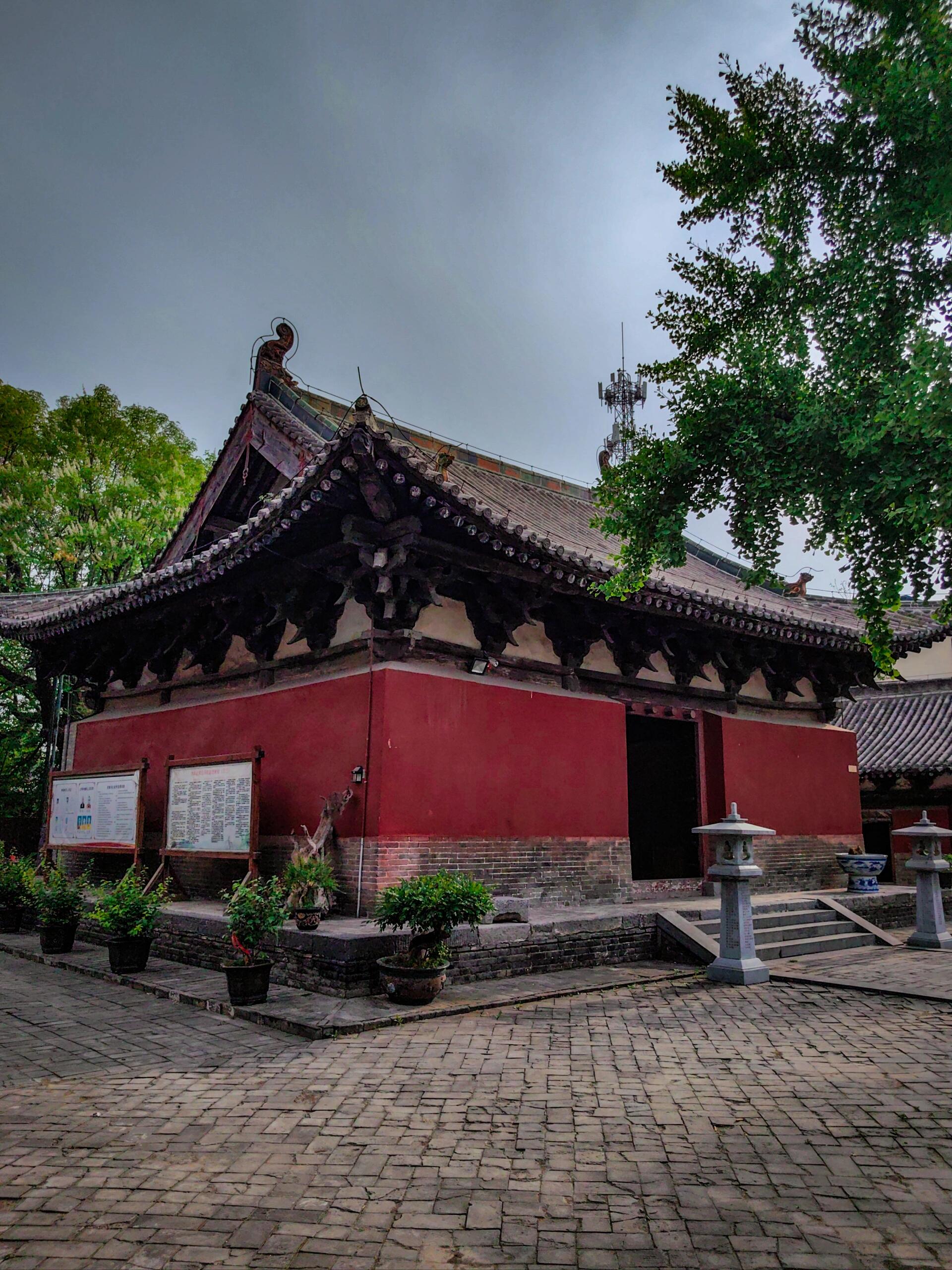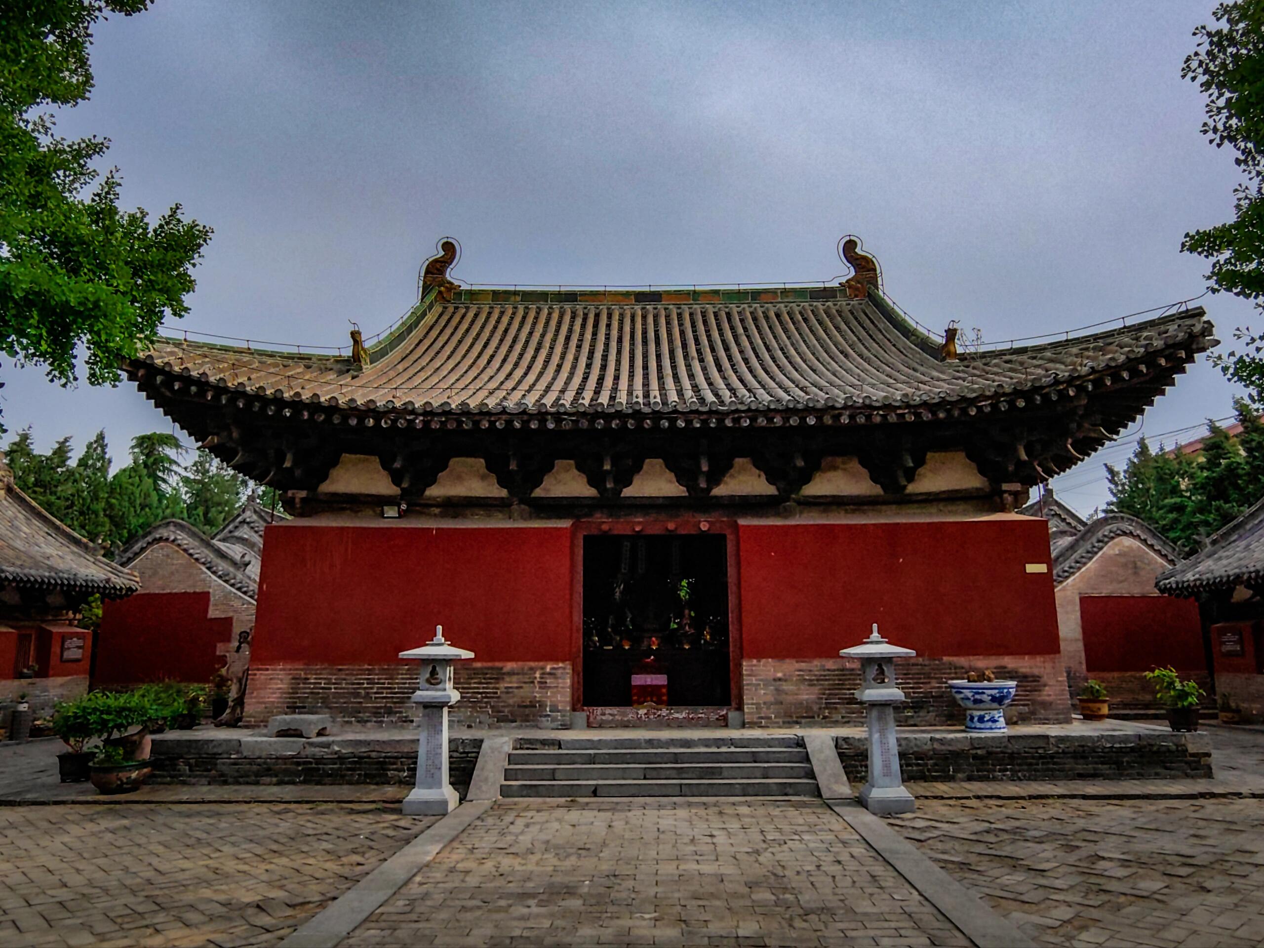穿过中佛殿,大雄宝殿的明代风格扑面而来。相较于元代建筑的雄浑,大雄宝殿的细节更加精致。单檐悬山顶的设计搭配琉璃脊饰,檐角微微上翘,灵动中带着几分优雅。斗拱用材变小,数量增多,装饰性明显增强;门窗隔扇上雕刻着精美的花鸟图案,刀法细腻流畅,每一处镂空雕花都是明代匠人技艺的见证。值得一提的是,大雄宝殿内的彩塑虽历经岁月褪色,但菩萨衣袂的褶皱、天王铠甲的纹路依然清晰可辨,人物神态或慈祥悲悯,或威严庄重,仿佛能将人带回那个香火鼎盛的年代。
