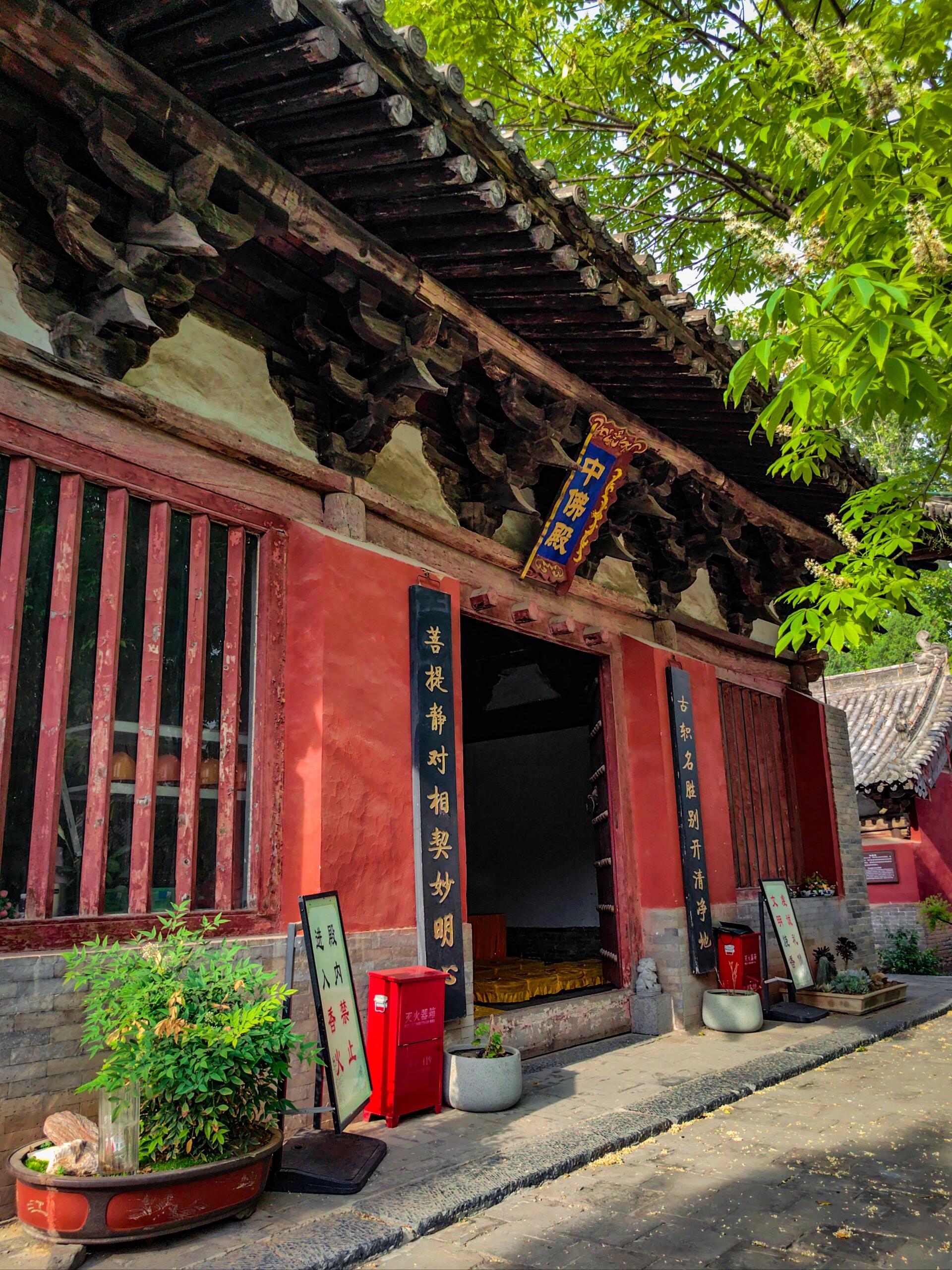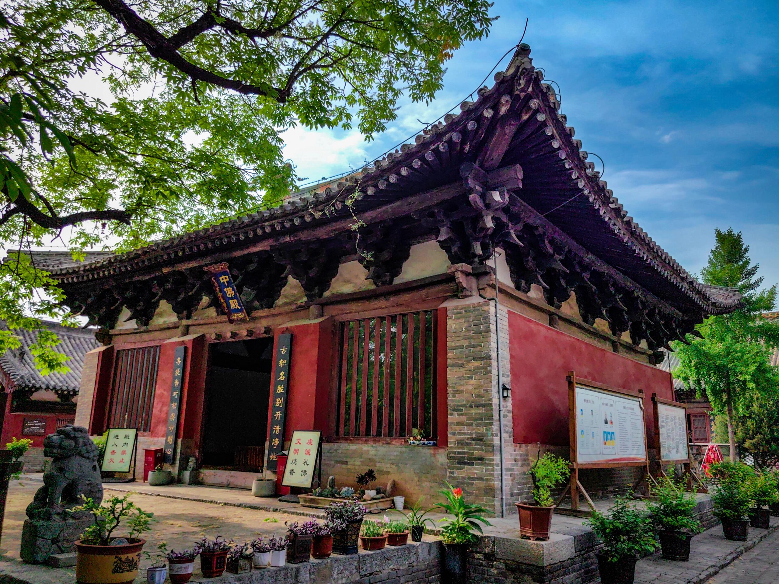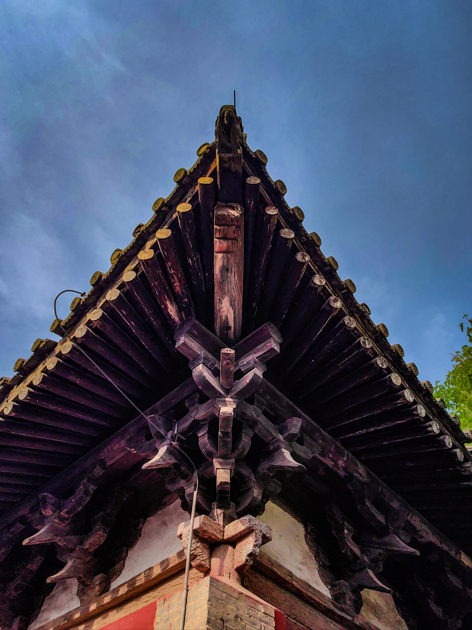 中佛殿是整座寺院最耀眼的存在,作为元代建筑的代表,它稳稳坐落在低矮的台基上,面阔三间,进深六架椽,单檐歇山顶的造型古朴大气。檐下的斗拱采用五铺作单抄单下昂的做法,补间铺作仅一朵,简洁却不失力度。不同于明清建筑日趋华丽的装饰风格,元代建筑特有的粗犷豪放在这里展露无遗:梁架结构采用四椽栿对后乳栿通檐用三柱,驼峰、蜀柱等构件线条硬朗,硕大的用材彰显着工匠对力学结构的自信。抬头细看,殿内的梁架未经过多修饰,原木的纹理清晰可见,仿佛能触摸到七百年前伐木工匠的斧凿痕迹。