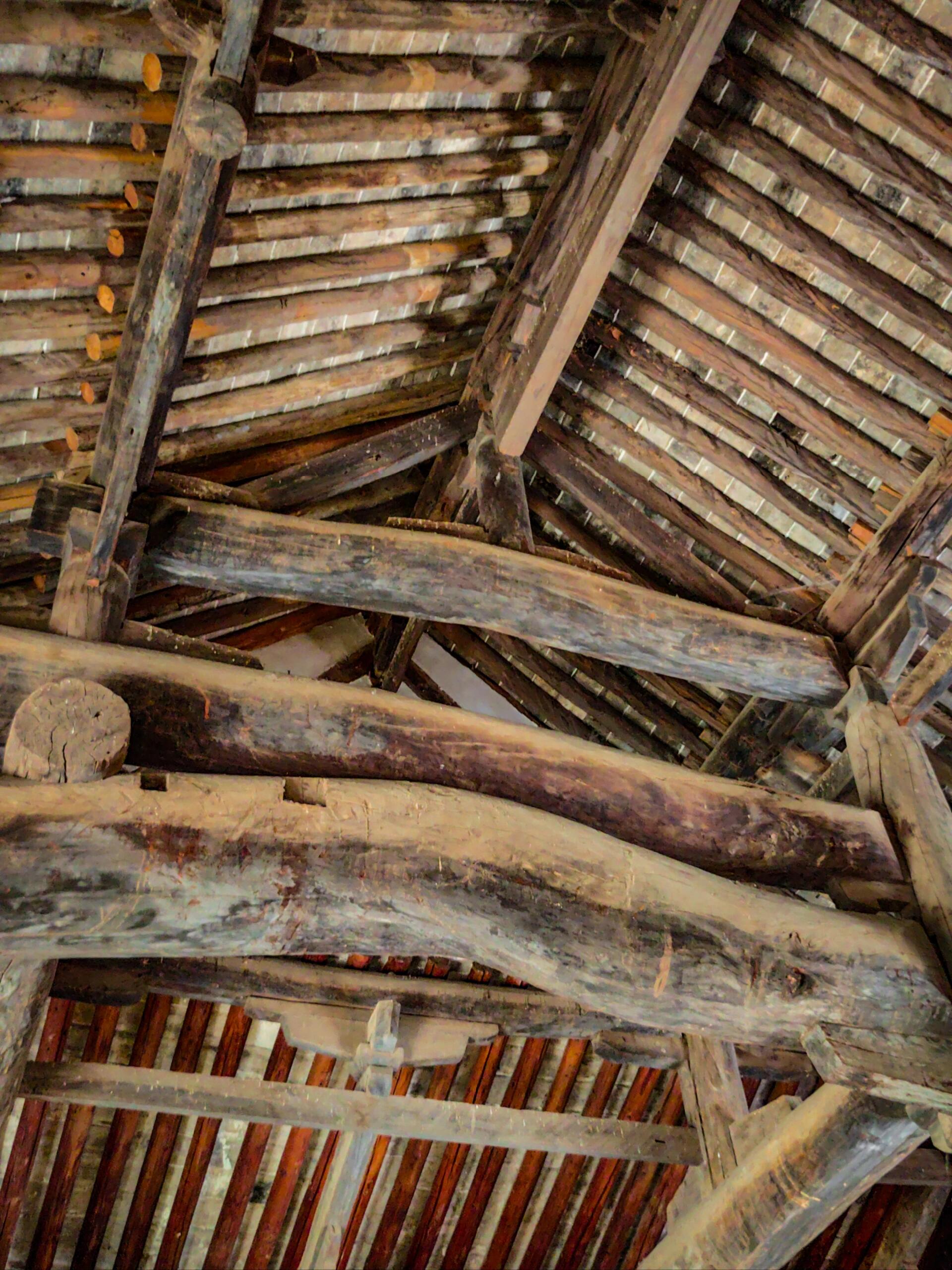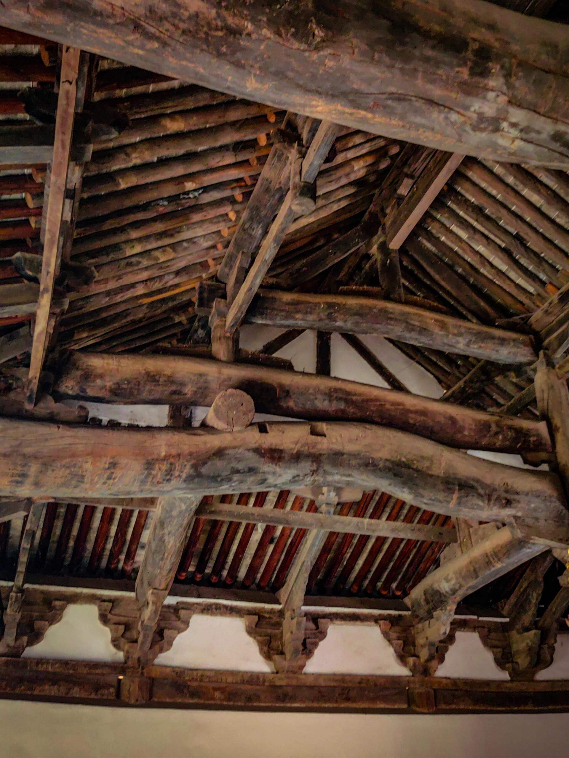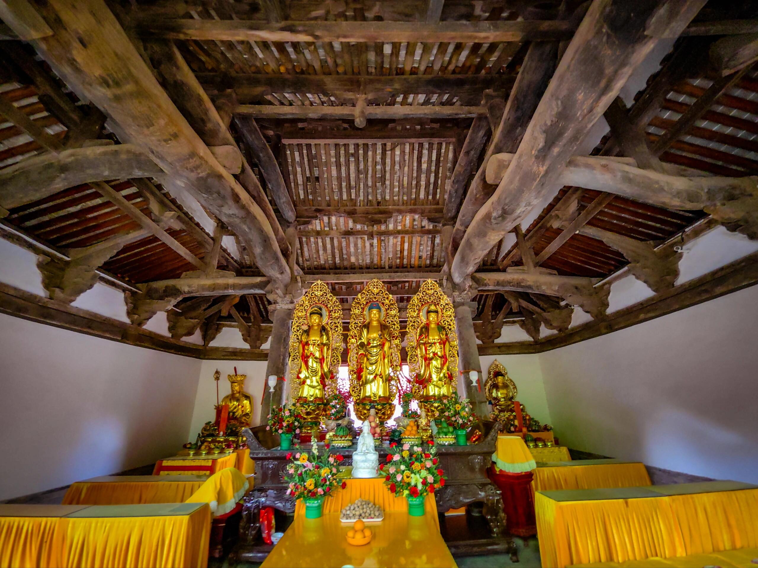 中佛殿是整座寺院最耀眼的存在,作为元代建筑的代表,它稳稳坐落在低矮的台基上,面阔三间,进深六架椽,单檐歇山顶的造型古朴大气。檐下的斗拱采用五铺作单抄单下昂的做法,补间铺作仅一朵,简洁却不失力度。不同于明清建筑日趋华丽的装饰风格,元代建筑特有的粗犷豪放在这里展露无遗:梁架结构采用四椽栿对后乳栿通檐用三柱,驼峰、蜀柱等构件线条硬朗,硕大的用材彰显着工匠对力学结构的自信。抬头细看,殿内的梁架未经过多修饰,原木的纹理清晰可见,仿佛能触摸到七百年前伐木工匠的斧凿痕迹。