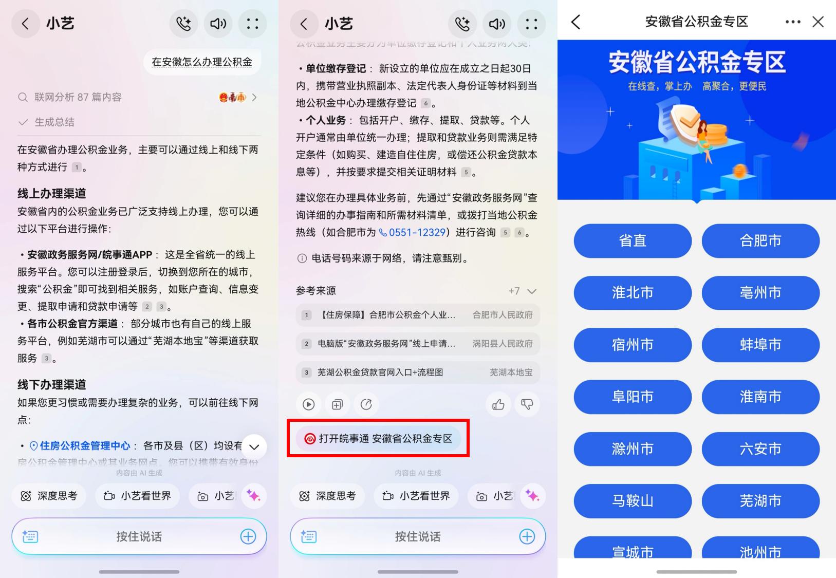 在接入鸿蒙意图框架后,鸿蒙版“皖事通”用户可通过语音交互轻松获取办事流程,一步直达业务办理入口。如想要办理公积金业务时,仅需询问小艺:“在安徽怎么办理公积金”,小艺将精准识别意图,主动推送办事入口,一键跳转、即点即办。这一交互方式的革新,让鸿蒙版“皖事通”实现了对用户需求的主动感知与智能引导,不仅有效解决了“政府业务在哪办、如何办”的问题,更实现了政务服务从“指尖办”到“张口就办”的转变,对于老年人或操作智能手机不便的用户尤其友好。