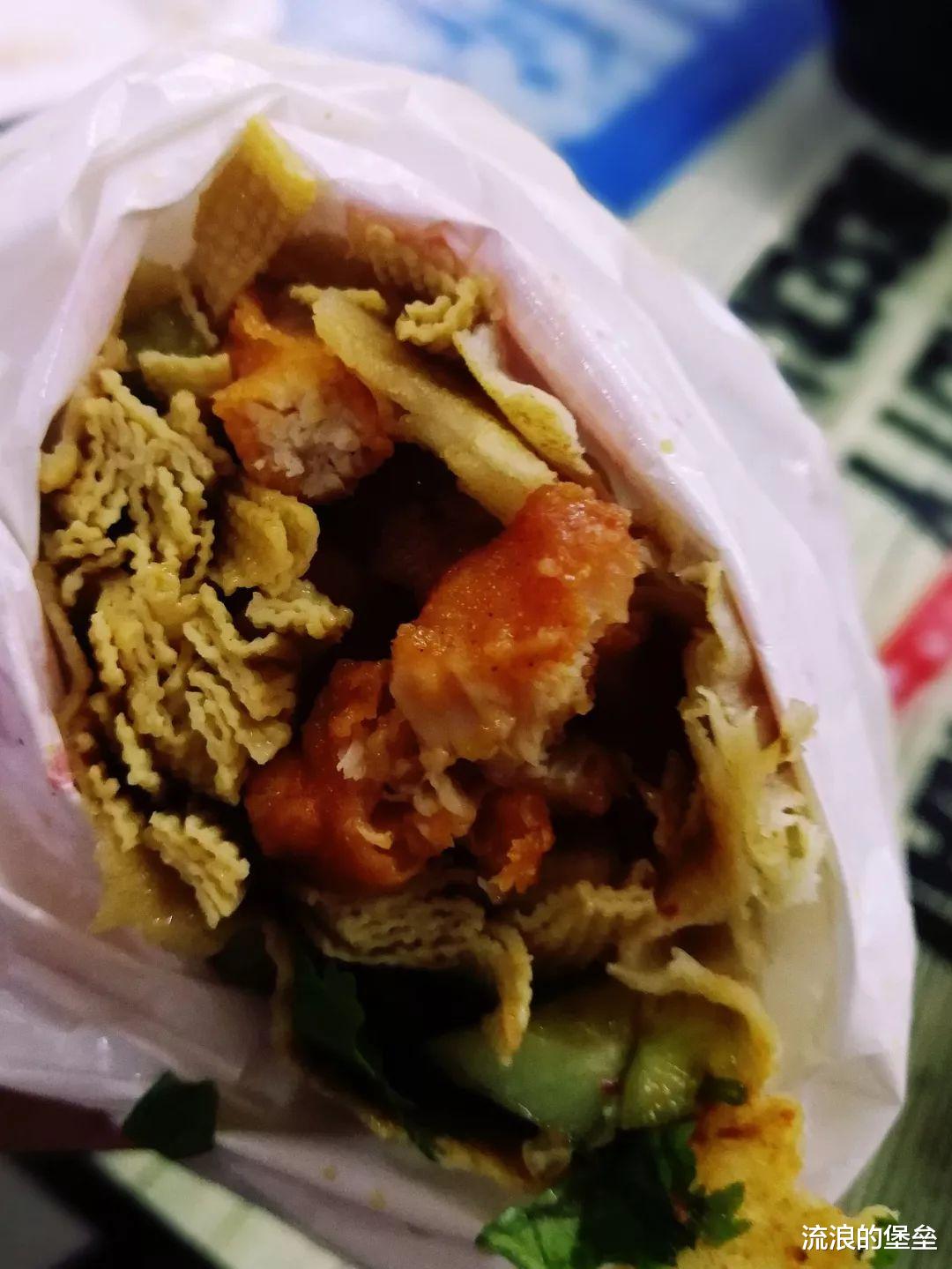 +第二种东北的大卷饼,大大的一张油饼,刷上辣酱,打上鸡蛋,放上土豆丝、香肠、辣条、肉片,超大一份,才12元