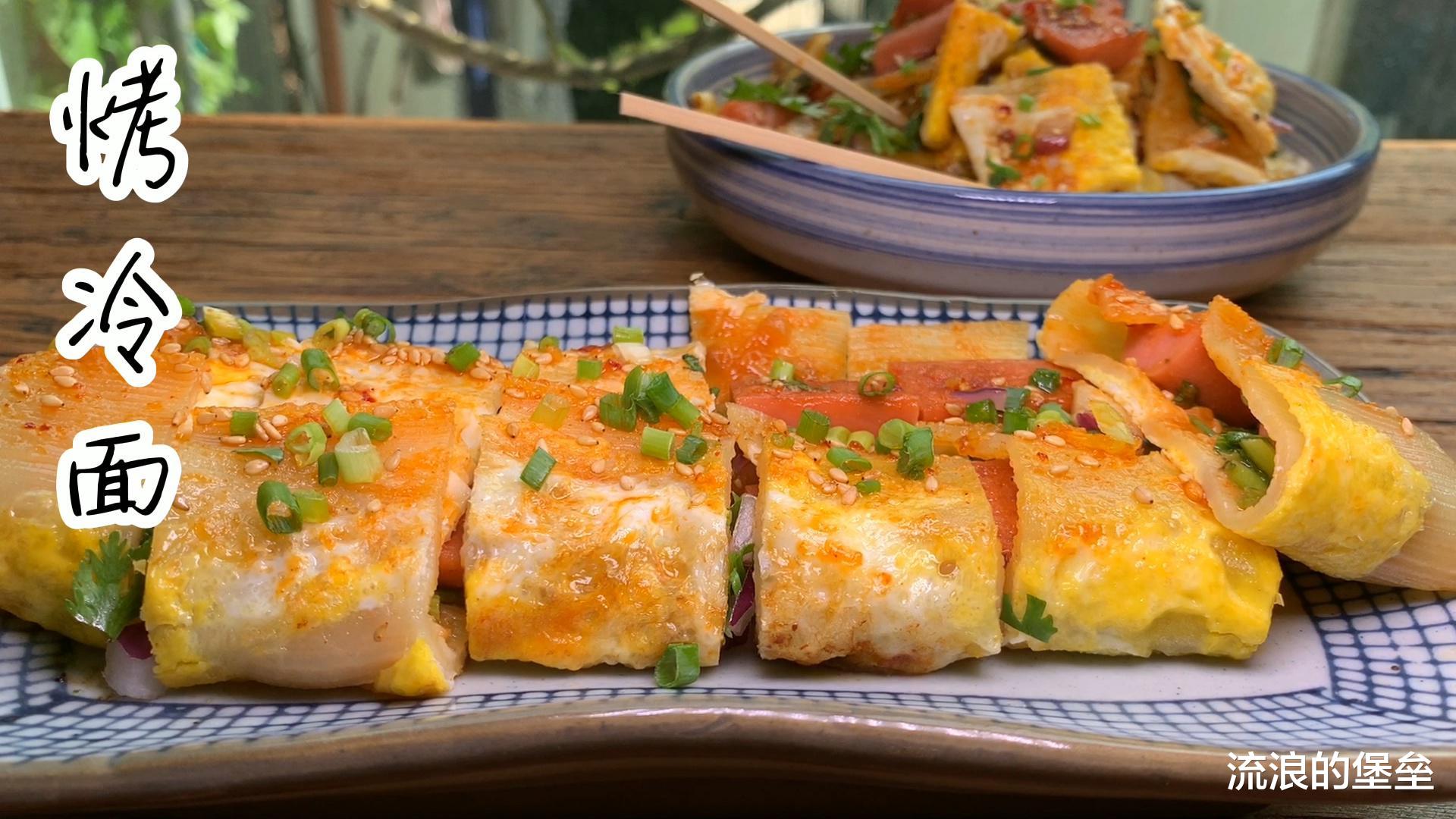 第一种烤冷面,冷面煎熟配上鸡蛋香肠,刷上酸甜酱料,谁能拒绝得了这口美味呢,一大早就也不嫌腻~