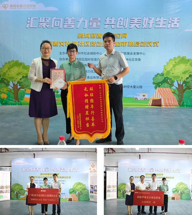 活动现场举行了温馨的爱心捐赠与合作伙伴授牌仪式。广州大旺食品有限公司深圳分公司为社区困弱群体、“一老一小”捐赠了价值73.64万元的国庆中秋关爱物资,并在节前把关爱和慰问送到了受助群体手中,展现了企业的社会责任与担当。深圳市社会捐助中心副主任张剑、深圳市中国慈展会发展中心副理事长兼秘书长郭云霞共同见证捐赠,并向企业颁发了捐赠证书。