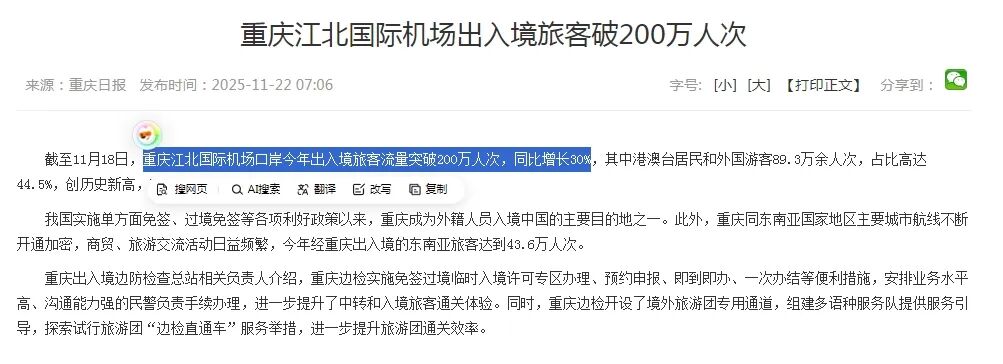 截至今年11月18日,重庆江北机场出入境旅客流量首次突破200万人次大关,同比大增30%!