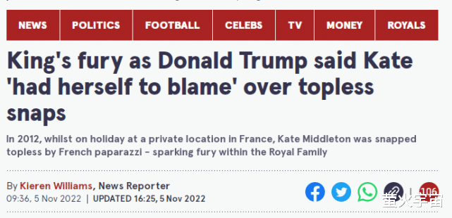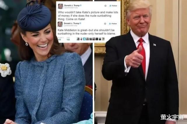 特朗普在其推特上评论道,凯特被人偷拍不能怨别人,“只能怪她自己”。而特朗普对凯特王妃遭偷拍这件事口出狂言,引发了英国王室高层成员的暴怒,包括查尔斯王子(当时还不是国王)、威廉王子、哈里王子在内的一些高级王室成员,对特朗普的不当评论做出了愤怒的回应,据当时媒体报道,这些王室高级成员用“滔滔不绝的脏话”回应特朗普先生。